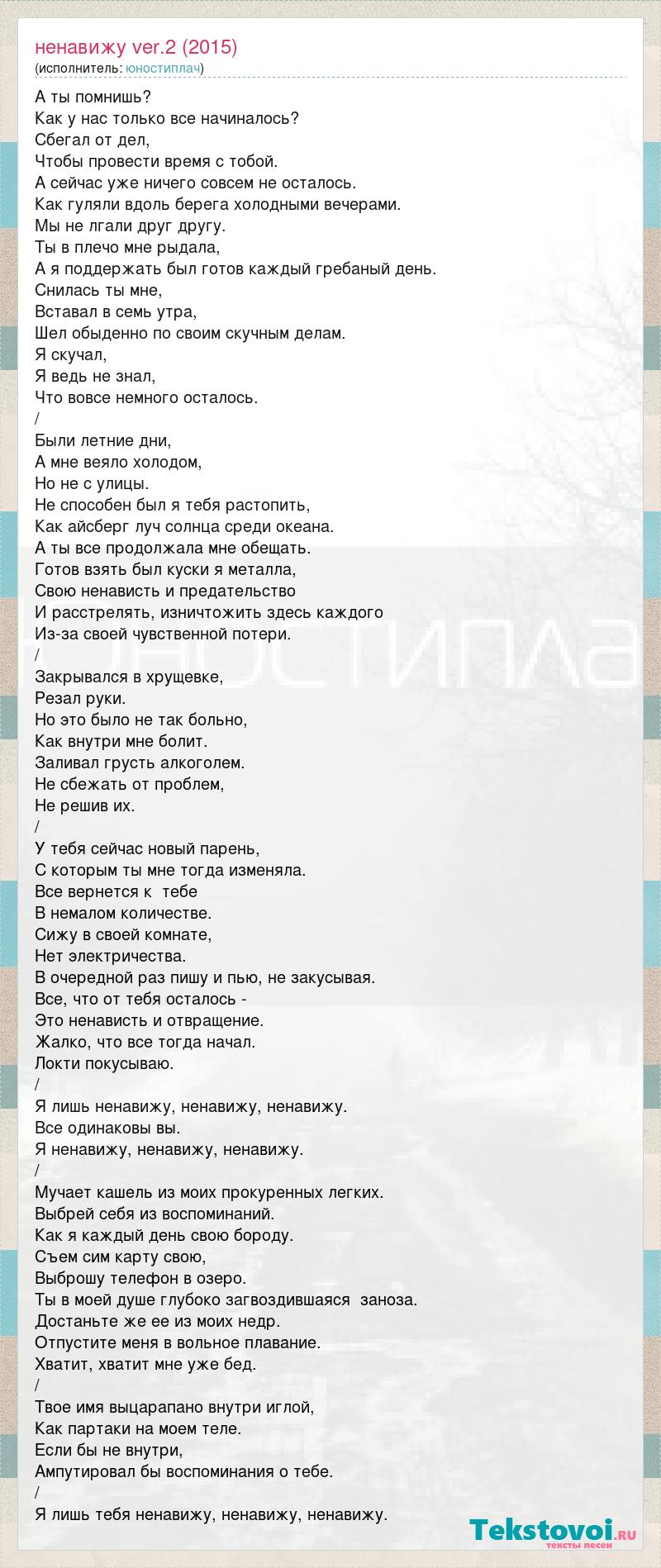 А ты помнишь? Как у нас только все начиналось? Сбегал от дел, Чтобы провести время с тобой. А сейчас уже ничего совсем не осталось. Как гуляли вдоль берега холодными вечерами. Мы не лгали друг другу. Ты в плечо мне рыдала, А я поддержать был готов каждый гребаный день. Снилась ты мне, Вставал в семь утра, Шел обыденно по своим скучным делам. Я скучал, Я ведь не знал, Что вовсе немного осталось. / Были летние дни, А мне веяло холодом, Но не с улицы. Не способен был я тебя растопить, Как айсберг луч солнца среди океана. А ты все продолжала мне обещать. Готов взять был куски я металла, Свою ненависть и предательство И расстрелять, изничтожить здесь каждого Из-за своей чувственной потери. / Закрывался в хрущевке, Резал руки. Но это было не так больно, Как внутри мне болит. Заливал грусть алкоголем. Не сбежать от проблем, Не решив их. / У тебя сейчас новый парень, С которым ты мне тогда изменяла. Все вернется к тебе В немалом количестве. Сижу в своей комнате, Нет электричества. В очередной раз пишу и пью, не закусывая. Все, что от тебя осталось - Это ненависть и отвращение. Жалко, что все тогда начал. Локти покусываю. / Я лишь ненавижу, ненавижу, ненавижу. Все одинаковы вы. Я ненавижу, ненавижу, ненавижу. / Мучает кашель из моих прокуренных легких. Выбрей себя из воспоминаний. Как я каждый день свою бороду. Съем сим карту свою, Выброшу телефон в озеро. Ты в моей душе глубоко загвоздившаяся заноза. Достаньте же ее из моих недр. Отпустите меня в вольное плавание. Хватит, хватит мне уже бед. / Твое имя выцарапано внутри иглой, Как партаки на моем теле. Если бы не внутри, Ампутировал бы воспоминания о тебе. / Я лишь тебя ненавижу, ненавижу, ненавижу.