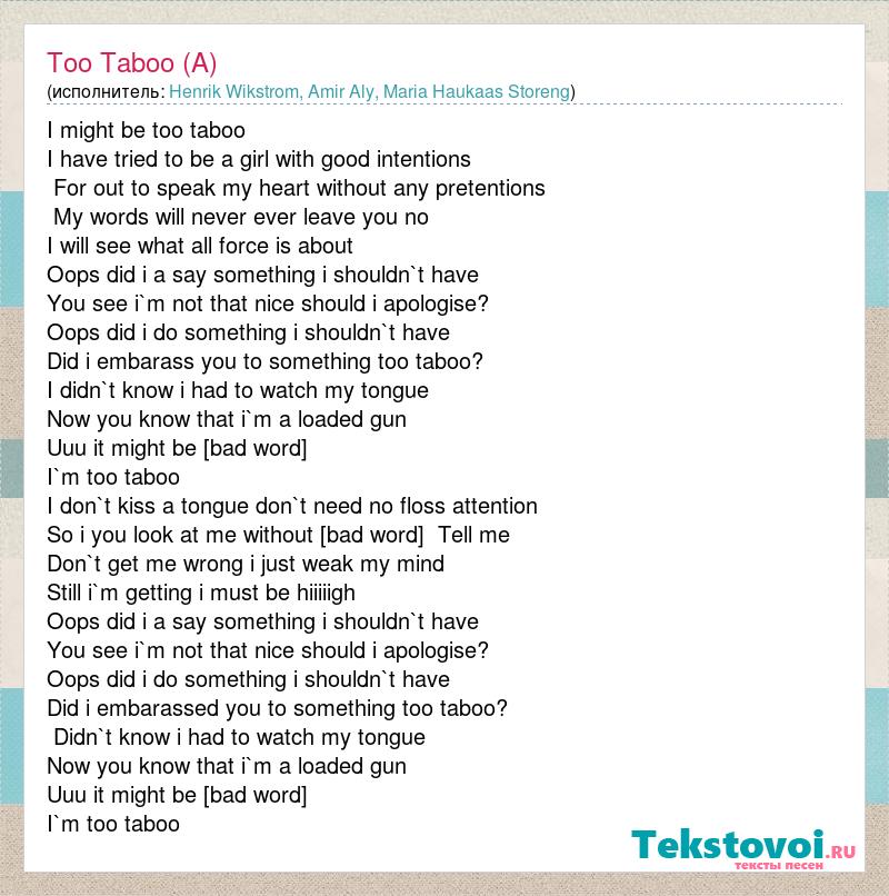 I might be too taboo I have tried to be a girl with good intentions For out to speak my heart without any pretentions My words will never ever leave you no I will see what all force is about Oops did i a say something i shouldn`t have You see i`m not that nice should i apologise? Oops did i do something i shouldn`t have Did i embarass you to something too taboo? I didn`t know i had to watch my tongue Now you know that i`m a loaded gun Uuu it might be true I`m too taboo I don`t kiss a tongue don`t need no floss attention So i you look at me without suspecious comprehensiion Tell me Don`t get me wrong i just weak my mind Still i`m getting i must be hiiiiigh Oops did i a say something i shouldn`t have You see i`m not that nice should i apologise? Oops did i do something i shouldn`t have Did i embarassed you to something too taboo? Didn`t know i had to watch my tongue Now you know that i`m a loaded gun Uuu it might be true I`m too taboo