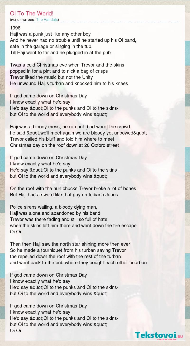 1996 Haji was a punk just like any other boy And he never had no trouble until he started up his Oi band, safe in the garage or singing in the tub. Till Haji went to far and he plugged in at the pub Twas a cold Christmas eve when Trevor and the skins popped in for a pint and to nick a bag of crisps Trevor liked the music but not the Unity He unwound Haji's turban and knocked him to his knees If god came down on Christmas Day I know exactly what he'd say He'd say "Oi to the punks and Oi to the skins- but Oi to the world and everybody wins!" Haji was a bloody mess, he ran out [bad word] the crowd he said "we'll meet again we are bloody yet unbowed" Trevor called his bluff and told him where to meet Christmas day on the roof down at 20 Oxford street If god came down on Christmas Day I know exactly what he'd say He'd say "Oi to the punks and Oi to the skins- but Oi to the world and everybody wins!" On the roof with the nun chucks Trevor broke a lot of bones But Haji had a sword like that guy on Indiana Jones Police sirens wailing, a bloody dying man, Haji was alone and abandoned by his band Trevor was there fading and still so full of hate when the skins left him there and went down the fire escape Oi Oi Then then Haji saw the north star shining more then ever So he made a tourniquet from his turban saving Trevor the repelled down the roof with the rest of the turban and went back to the pub where they bought each other bourbon If god came down on Christmas Day I know exactly what he'd say He'd say "Oi to the punks and Oi to the skins- but Oi to the world and everybody wins!" If god came down on Christmas Day I know exactly what he'd say He'd say "Oi to the punks and Oi to the skins- but Oi to the world and everybody wins!" Oi Oi