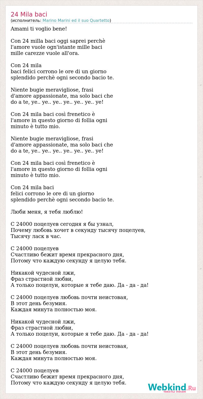 Amami ti voglio bene! Con 24 milla baci oggi saprei perchè l'amore vuole ogn'istante mille baci mille carezze vuole all'ora. Con 24 mila baci felici corrono le ore di un giorno splendido perchè ogni secondo bacio te. Niente bugie meravigliose, frasi d'amore appassionate, ma solo baci che do a te, ye.. ye.. ye.. ye.. ye.. ye.. ye! Con 24 mila baci così frenetico è l'amore in questo giorno di follia ogni minuto è tutto mio. Niente bugie meravigliose, frasi d'amore appassionate, ma solo baci che do a te, ye.. ye.. ye.. ye.. ye.. ye.. ye! Con 24 mila baci così frenetico è l'amore in questo giorno di follia ogni minuto è tutto mio. Con 24 mila baci felici corrono le ore di un giorno splendido perchè ogni secondo bacio te. Люби меня, я тебя люблю! С 24000 поцелуев cегодня я бы узнал, Почему любовь хочет в секунду тысячу поцелуев, Тысячу ласк в час. С 24000 поцелуев Счастливо бежит время прекрасного дня, Потому что каждую секунду я целую тебя. Никакой чудесной лжи, Фраз страстной любви, А только поцелуи, которые я тебе даю. Да - да - да! С 24000 поцелуев любовь почти неистовая, В этот день безумия. Каждая минута полностью моя. Никакой чудесной лжи, Фраз страстной любви, А только поцелуи, которые я тебе даю. Да - да - да! С 24000 поцелуев любовь почти неистовая, В этот день безумия. Каждая минута полностью моя. С 24000 поцелуев Счастливо бежит время прекрасного дня, Потому что каждую секунду я целую тебя.