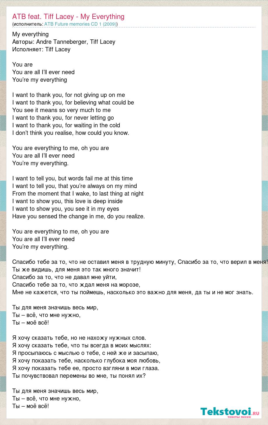 My everything Авторы: Andre Tanneberger, Tiff Lacey Исполняет: Tiff Lacey You are You are all I’ll ever need You’re my everything I want to thank you, for not giving up on me I want to thank you, for believing what could be You see it means so very much to me I want to thank you, for never letting go I want to thank you, for waiting in the cold I don’t think you realise, how could you know. You are everything to me, oh you are You are all I’ll ever need You’re my everything. I want to tell you, but words fail me at this time I want to tell you, that you’re always on my mind From the moment that I wake, to last thing at night I want to show you, this love is deep inside I want to show you, you see it in my eyes Have you sensed the change in me, do you realize. You are everything to me, oh you are You are all I’ll ever need You’re my everything. Спасибо тебе за то, что не оставил меня в трудную минуту, Спасибо за то, что верил в меня! Ты же видишь, для меня это так много значит! Спасибо за то, что не давал мне уйти, Спасибо тебе за то, что ждал меня на морозе, Мне не кажется, что ты поймешь, насколько это важно для меня, да ты и не мог знать. Ты для меня значишь весь мир, Ты – всё, что мне нужно, Ты – моё всё! Я хочу сказать тебе, но не нахожу нужных слов. Я хочу сказать тебе, что ты всегда в моих мыслях: Я просыпаюсь с мыслью о тебе, с ней же и засыпаю, Я хочу показать тебе, насколько глубока моя любовь, Я хочу показать тебе ее, просто взгляни в мои глаза. Ты почувствовал перемены во мне, ты понял их? Ты для меня значишь весь мир, Ты – всё, что мне нужно, Ты – моё всё!