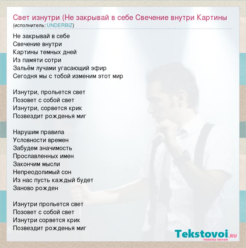 Главная→Исполнители→Underbiz→Свет изнутри (Не закрывай в себе Свечение внутри Картины темных дней Из пам