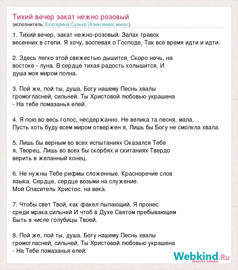1. Тихий вечер, закат нежно-розовый. Запах травок весенних в степи. Я хочу, воспевая о Господе, Так все время идти и идти. 2. Здесь легко этой свежестью дышится, Скоро ночь, на востоке - луна. В сердце тихая радость колышится, И душа моя миром полна. 3. Пой же, пой ты, душа, Богу нашему Песнь хвалы громогласней, сильней. Ты Христовой любовью украшена - На тебе помазанья елей. 4. Я пою во весь голос, несдержанно. Не велика та песня, мала. Пусть хоть буду всем миром отвержен я, Лишь бы Богу не смолкла хвала. 5. Лишь бы верным во всех испытаниях Оказался Тебе я, Творец. Лишь во всех бы скорбях и скитаниях Твердо верить в желанный конец. 6. Не нужны Тебе рифмы сложенные. Красноречие слов языка. Сердце, сердце возьми на служение. Мой Спаситель Христос, на века. 7. Чтобы свет Твой, как факел пылающий, Я пронес среди мрака сильней И чтоб в Духе Святом пребывающем Быть в числе голубицы Твоей. 8. Пой же, пой ты, душа. Богу нашему Песнь хвалы громогласней, сильней. Ты Христовой любовью украшена - На Тебе помазанья елей.