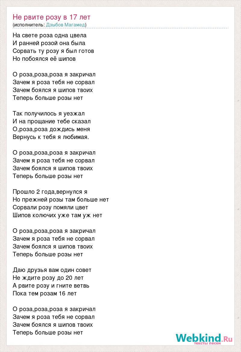 На свете роза одна цвела И ранней розой она была Сорвать ту розу я был готов Но побоялся её шипов О роза,роза,роза я закричал Зачем я роза тебя не сорвал Зачем боялся я шипов твоих Теперь больше розы нет Так получилось я уезжал И на прощание тебе сказал О,роза,роза дождись меня Вернусь к тебя я любимая. О роза,роза,роза я закричал Зачем я роза тебя не сорвал Зачем боялся я шипов твоих Теперь больше розы нет Прошло 2 года,вернулся я Но прежней розы там больше нет Сорвали розу помяли цвет Шипов колючих уже там уж нет О роза,роза,роза я закричал Зачем я роза тебя не сорвал Зачем боялся я шипов твоих Теперь больше розы нет Даю друзья вам один совет Не ждите розу до 20 лет А рвите розу и гните ветвь Пока тем розам 16 лет О роза,роза,роза я закричал Зачем я роза тебя не сорвал Зачем боялся я шипов твоих Теперь больше розы нет
