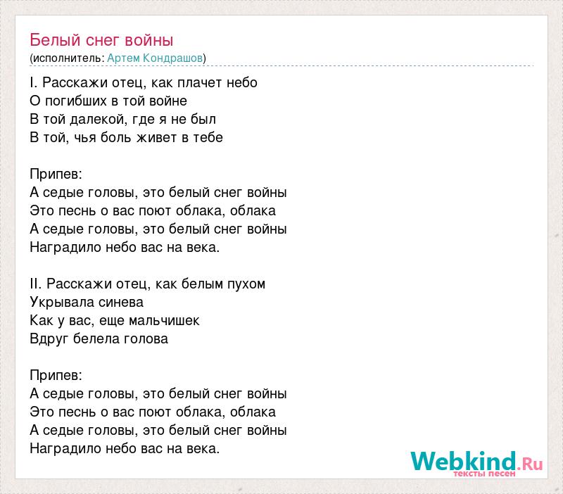 І. Расcкажи отец, как плачет небо О погибших в той войне В той далекой, где я не был В той, чья боль живет в тебе Припев: А седые головы, это белый снег войны Это песнь о вас поют облака, облака А седые головы, это белый снег войны Наградило небо вас на века. ІІ. Расcкажи отец, как белым пухом Укрывала синева Как у вас, еще мальчишек Вдруг белела голова Припев: А седые головы, это белый снег войны Это песнь о вас поют облака, облака А седые головы, это белый снег войны Наградило небо вас на века.