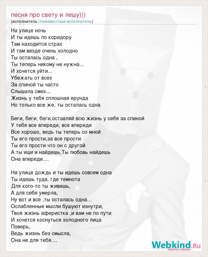 На улице ночь И ты идешь по коридору Там находится страх И там везде очень холодно Ты осталась одна , Ты теперь никому не нужна... И хочется уйти... Убежать от всех За спиной ты часто Слышала смех... Жизнь у тебя сплошная ерунда Но только все же, ты осталась одна Беги, беги, беги,оставляй всю жизнь у себя за спиной У тебя все впереди, все впереди Все хорошо, ведь ты теперь со мной Ты его прости,за все прости Ты его прости что он с другой А ты ищи и найдешь,Ты любовь найдешь Она впереди.... На улице дождь и ты идешь совсем одна Ты идешь туда, где темнота Для кого-то ты живешь, А для себя умерла, Ну вот и все ,ты осталась одна... Ослабленные мысли бушуют изнутри, Твоя жизнь аферистка ,и вам не по пути И хочется коснуться холодного лица Поверь, Ведь жизнь без смысла, Она не для тебя....
