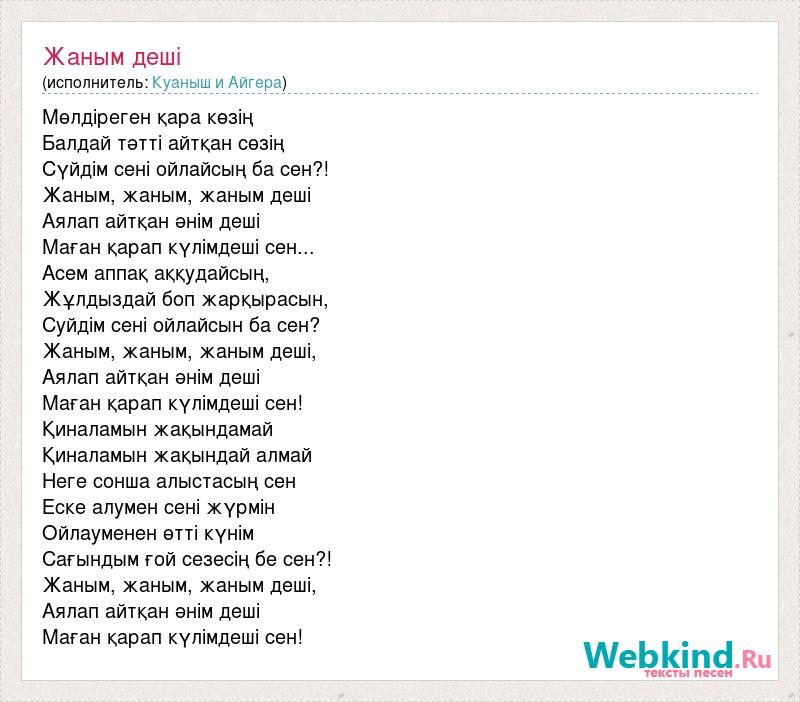 Мөлдіреген қара көзің Балдай тәтті айтқан сөзің Сүйдім сені ойлайсың ба сен?! Жаным, жаным, жаным деші Аялап айтқан әнім деші Маған қарап күлімдеші сен... Асем аппақ аққудайсың, Жұлдыздай боп жарқырасын, Суйдiм сенi ойлайсын ба сен? Жаным, жаным, жаным деші, Аялап айтқан әнім деші Маған қарап күлімдеші сен! Қиналамын жақындамай Қиналамын жақындай алмай Неге сонша алыстасың сен Еске алумен сені жүрмін Ойлауменен өтті күнім Сағындым ғой сезесің бе сен?! Жаным, жаным, жаным деші, Аялап айтқан әнім деші Маған қарап күлімдеші сен!