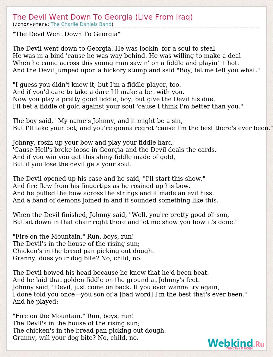 "The Devil Went Down To Georgia" The Devil went down to Georgia. He was lookin' for a soul to steal. He was in a bind 'cause he was way behind. He was willing to make a deal When he came across this young man sawin' on a fiddle and playin' it hot. And the Devil jumped upon a hickory stump and said "Boy, let me tell you what." "I guess you didn't know it, but I'm a fiddle player, too. And if you'd care to take a dare I'll make a bet with you. Now you play a pretty good fiddle, boy, but give the Devil his due. I'll bet a fiddle of gold against your soul 'cause I think I'm better than you." The boy said, "My name's Johnny, and it might be a sin, But I'll take your bet; and you're gonna regret 'cause I'm the best there's ever been." Johnny, rosin up your bow and play your fiddle hard. 'Cause Hell's broke loose in Georgia and the Devil deals the cards. And if you win you get this shiny fiddle made of gold, But if you lose the devil gets your soul. The Devil opened up his case and he said, "I'll start this show." And fire flew from his fingertips as he rosined up his bow. And he pulled the bow across the strings and it made an evil hiss. And a band of demons joined in and it sounded something like this. When the Devil finished, Johnny said, "Well, you're pretty good ol' son, But sit down in that chair right there and let me show you how it's done." "Fire on the Mountain." Run, boys, run! The Devil's in the house of the rising sun; Chicken's in the bread pan picking out dough. Granny, does your dog bite? No, child, no. The Devil bowed his head because he knew that he'd been beat. And he laid that golden fiddle on the ground at Johnny's feet. Johnny said, "Devil, just come on back. If you ever wanna try again, I done told you once—you son of a [bad word] I'm the best that's ever been." And he played: "Fire on the Mountain." Run, boys, run! The Devil's in the house of the rising sun; The chicken's in the bread pan picking out dough. Granny, will your dog bite? No, child, no.