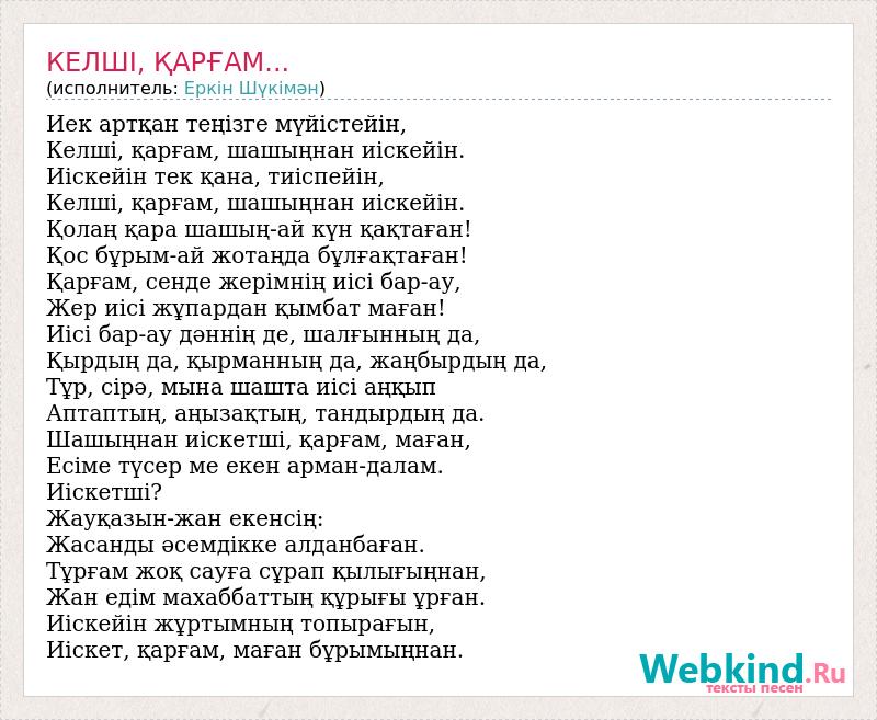 Иек артқан теңізге мүйістейін, Келші, қарғам, шашыңнан иіскейін. Иіскейін тек қана, тиіспейін, Келші, қарғам, шашыңнан иіскейін. Қолаң қара шашың-ай күн қақтаған! Қос бұрым-ай жотаңда бұлғақтаған! Қарғам, сенде жерімнің иісі бар-ау, Жер иісі жұпардан қымбат маған! Иісі бар-ау дәннің де, шалғынның да, Қырдың да, қырманның да, жаңбырдың да, Тұр, сірә, мына шашта иісі аңқып Аптаптың, аңызақтың, тандырдың да. Шашыңнан иіскетші, қарғам, маған, Есіме түсер ме екен арман-далам. Иіскетші? Жауқазын-жан екенсің: Жасанды әсемдікке алданбаған. Тұрғам жоқ сауға сұрап қылығыңнан, Жан едім махаббаттың құрығы ұрған. Иіскейін жұртымның топырағын, Иіскет, қарғам, маған бұрымыңнан.