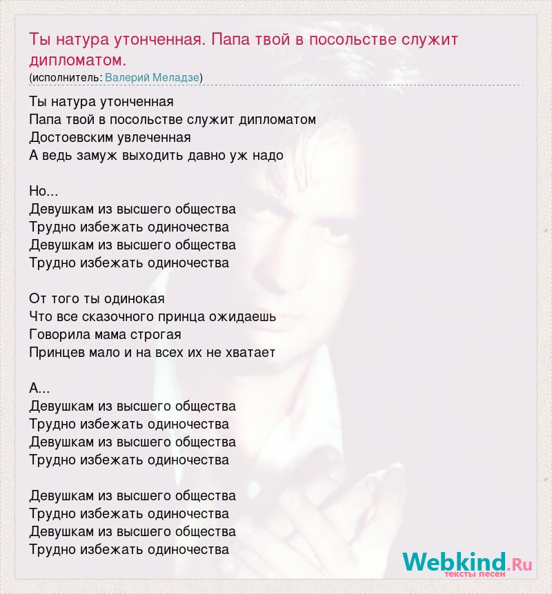 Главная→Исполнители→Валерий Меладзе→Ты натура утонченная. Папа твой в посольстве служит дипломатом. Достоевским увле