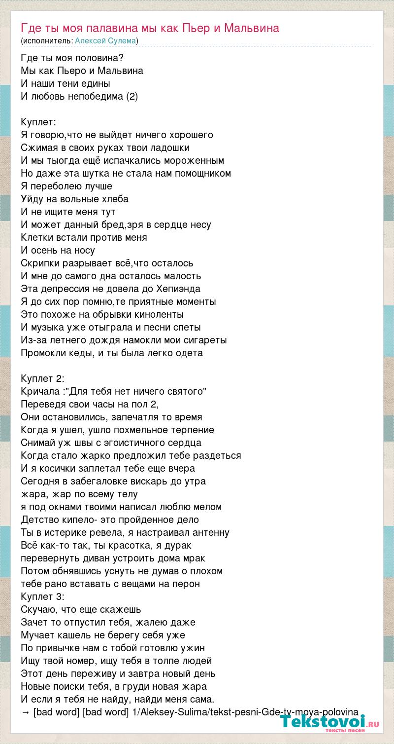 Где ты моя половина? Мы как Пьеро и Мальвина И наши тени едины И любовь непобедима (2) Куплет: Я говорю,что не выйдет ничего хорошего Сжимая в своих руках твои ладошки И мы тыогда ещё испачкались мороженным Но даже эта шутка не стала нам помощником Я переболею лучше Уйду на вольные хлеба И не ищите меня тут И может данный бред,зря в сердце несу Клетки встали против меня И осень на носу Скрипки разрывает всё,что осталось И мне до самого дна осталось малость Эта депрессия не довела до Хепиэнда Я до сих пор помню,те приятные моменты Это похоже на обрывки киноленты И музыка уже отыграла и песни спеты Из-за летнего дождя намокли мои сигареты Промокли кеды, и ты была легко одета Куплет 2: Кричала :"Для тебя нет ничего святого" Переведя свои часы на пол 2, Они остановились, запечатля то время Когда я ушел, ушло похмельное терпение Снимай уж швы с эгоистичного сердца Когда стало жарко предложил тебе раздеться И я косички заплетал тебе еще вчера Сегодня в забегаловке вискарь до утра жара, жар по всему телу я под окнами твоими написал люблю мелом Детство кипело- это пройденное дело Ты в истерике ревела, я настраивал антенну Всё как-то так, ты красотка, я дурак перевернуть диван устроить дома мрак Потом обнявшись уснуть не думав о плохом тебе рано вставать с вещами на перон Куплет 3: Скучаю, что еще скажешь Зачет то отпустил тебя, жалею даже Мучает кашель не берегу себя уже По привычке нам с тобой готовлю ужин Ищу твой номер, ищу тебя в толпе людей Этот день переживу и завтра новый день Новые поиски тебя, в груди новая жара И если я тебя не найду, найди меня сама. → [bad word] [bad word] 1/Aleksey-Sulima/tekst-pesni-Gde-ty-moya-polovina