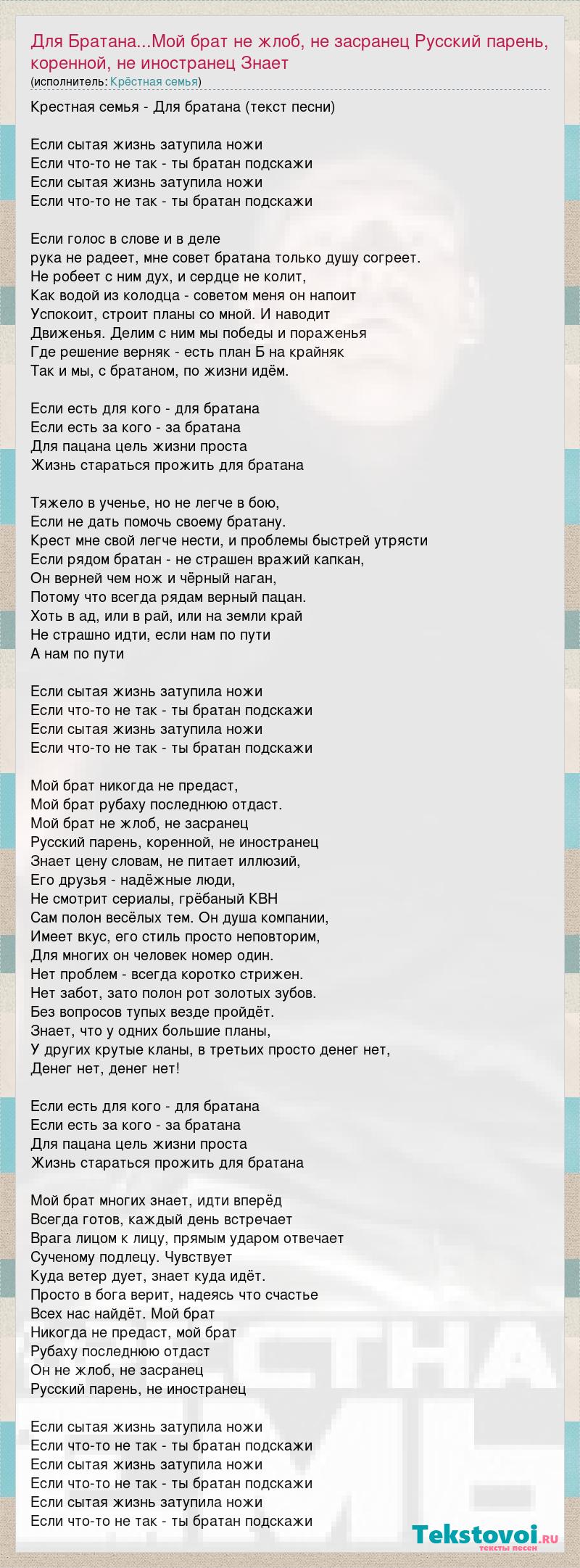 Главная→Исполнители→Крёстная Семья→Для Братана...Мой брат не жлоб, не засранец Русский парень, коренной, не ино