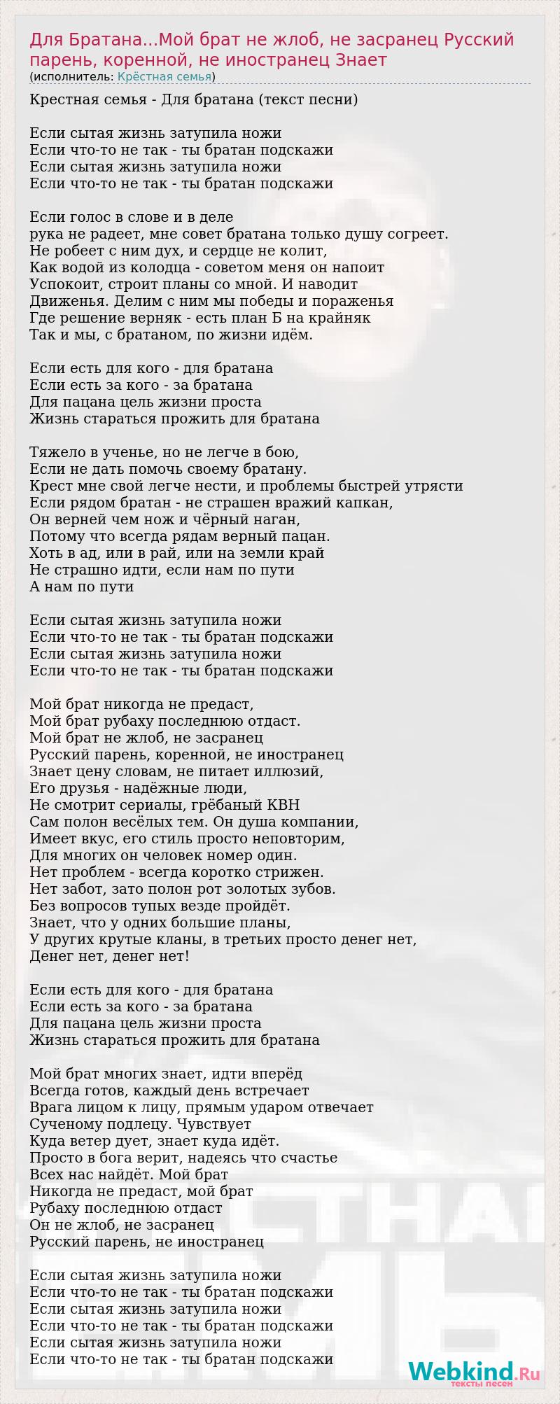 Крестная семья - Для братана (текст песни) Если сытая жизнь затупила ножи Если что-то не так - ты братан подскажи Если сытая жизнь затупила ножи Если что-то не так - ты братан подскажи Если голос в слове и в деле рука не радеет, мне совет братана только душу согреет. Не робеет с ним дух, и сердце не колит, Как водой из колодца - советом меня он напоит Успокоит, строит планы со мной. И наводит Движенья. Делим с ним мы победы и пораженья Где решение верняк - есть план Б на крайняк Так и мы, с братаном, по жизни идём. Если есть для кого - для братана Если есть за кого - за братана Для пацана цель жизни проста Жизнь стараться прожить для братана Тяжело в ученье, но не легче в бою, Если не дать помочь своему братану. Крест мне свой легче нести, и проблемы быстрей утрясти Если рядом братан - не страшен вражий капкан, Он верней чем нож и чёрный наган, Потому что всегда рядам верный пацан. Хоть в ад, или в рай, или на земли край Не страшно идти, если нам по пути А нам по пути Если сытая жизнь затупила ножи Если что-то не так - ты братан подскажи Если сытая жизнь затупила ножи Если что-то не так - ты братан подскажи Мой брат никогда не предаст, Мой брат рубаху последнюю отдаст. Мой брат не жлоб, не засранец Русский парень, коренной, не иностранец Знает цену словам, не питает иллюзий, Его друзья - надёжные люди, Не смотрит сериалы, грёбаный КВН Сам полон весёлых тем. Он душа компании, Имеет вкус, его стиль просто неповторим, Для многих он человек номер один. Нет проблем - всегда коротко стрижен. Нет забот, зато полон рот золотых зубов. Без вопросов тупых везде пройдёт. Знает, что у одних большие планы, У других крутые кланы, в третьих просто денег нет, Денег нет, денег нет! Если есть для кого - для братана Если есть за кого - за братана Для пацана цель жизни проста Жизнь стараться прожить для братана Мой брат многих знает, идти вперёд Всегда готов, каждый день встречает Врага лицом к лицу, прямым ударом отвечает Сученому подлецу. Чувствует Куда ветер дует, знает куда идёт. Просто в бога верит, надеясь что счастье Всех нас найдёт. Мой брат Никогда не предаст, мой брат Рубаху последнюю отдаст Он не жлоб, не засранец Русский парень, не иностранец Если сытая жизнь затупила ножи Если что-то не так - ты братан подскажи Если сытая жизнь затупила ножи Если что-то не так - ты братан подскажи Если сытая жизнь затупила ножи Если что-то не так - ты братан подскажи