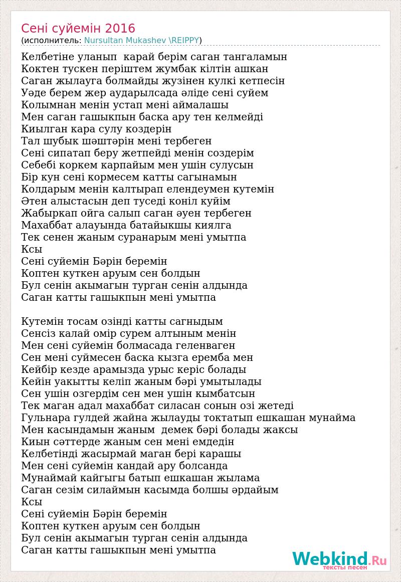 Келбетіне уланып карай берім саган тангаламын Коктен тускен періштем жумбак кілтін ашкан Саган жылауга болмайды жузінен кулкі кетпесін Уәде берем жер аударылсада әліде сені суйем Колымнан менін устап мені аймалашы Мен саган гашыкпын баска ару тен келмейді Киылган кара сулу коздерін Тал шубык шәштәрін мені тербеген Сені сипатап беру жетпейді менін создерім Себебі коркем карпайым мен ушін сулусын Бір кун сені кормесем катты сагынамын Колдарым менін калтырап елендеумен кутемін Әтен алыстасын деп туседі коніл куйім Жабыркап ойга салып саган әуен тербеген Махаббат алауында батайыкшы киялга Тек сенен жаным суранарым мені умытпа Ксы Сені суйемін Бәрін беремін Коптен куткен аруым сен болдын Бул сенін акымагын турган сенін алдында Саган катты гашыкпын мені умытпа Кутемін тосам озінді катты сагныдым Сенсіз калай омір сурем алтыным менін Мен сені суйемін болмасада геленваген Сен мені суймесен баска кызга еремба мен Кейбір кезде арамызда урыс керіс болады Кейін уакытты келіп жаным бәрі умытылады Сен ушін озгердім сен мен ушін кымбатсын Тек маган адал махаббат силасан сонын озі жетеді Гульнара гулдей жайна жылауды токтатып ешкашан мунайма Мен касындамын жаным демек бәрі болады жаксы Киын сәттерде жаным сен мені емдедін Келбетінді жасырмай маган бері карашы Мен сені суйемін кандай ару болсанда Мунаймай кайгыгы батып ешкашан жылама Саган сезім силаймын касымда болшы әрдайым Ксы Сені суйемін Бәрін беремін Коптен куткен аруым сен болдын Бул сенін акымагын турган сенін алдында Саган катты гашыкпын мені умытпа