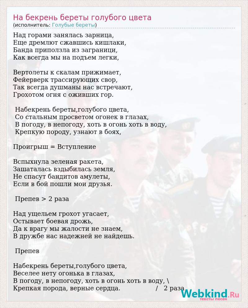 Над горами занялась зарница, Еще дремлют сжавшись кишлаки, Банда приползла из заграници, Как всегда мы на подъем легки, Вертолеты к скалам прижимает, Фейерверк трассирующих свор, Так всегда душманы нас встречают, Грохотом огня с оживших гор. Набекрень береты,голубого цвета, Со стальным просветом огонек в глазах, В погоду, в непогоду, хоть в огонь хоть в воду, Крепкую породу, узнают в боях, Проигрыш = Вступление Вспыхнула зеленая ракета, Зашаталась вздыбилась земля, Не спасут бандитов амулеты, Если в бой пошли мои друзья. Препев > 2 раза Над ущельем грохот угасает, Остывает боевая дрожь, Да к врагу мы жалости не знаем, В дружбе нас надежней не найдешь. Препев Набекрень береты,голубого цвета, Веселее нету огонька в глазах, В погоду, в непогоду, хоть в огонь хоть в воду, \ Крепкая порода, верные сердца. / 2 раза