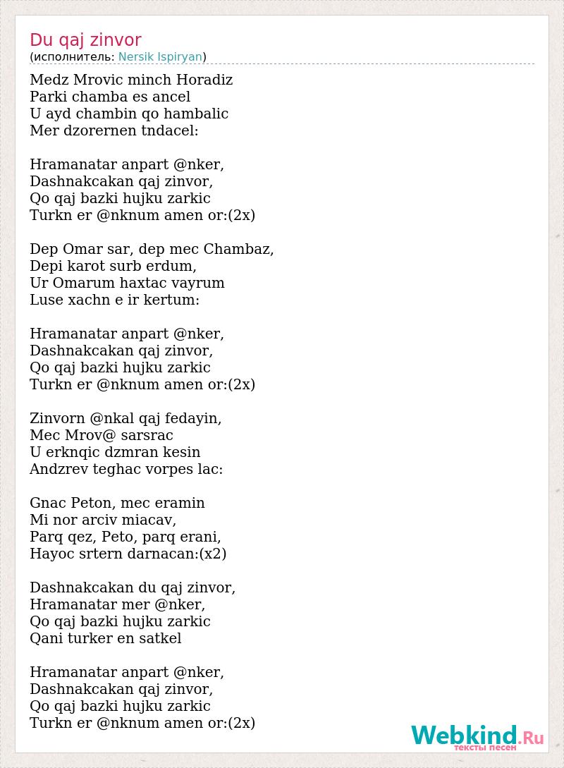 Medz Mrovic minch Horadiz Parki chamba es ancel U ayd chambin qo hambalic Mer dzorernen tndacel: Hramanatar anpart @nker, Dashnakcakan qaj zinvor, Qo qaj bazki hujku zarkic Turkn er @nknum amen or:(2х) Dep Omar sar, dep mec Chambaz, Depi karot surb erdum, Ur Omarum haxtac vayrum Luse xachn e ir kertum: Hramanatar anpart @nker, Dashnakcakan qaj zinvor, Qo qaj bazki hujku zarkic Turkn er @nknum amen or:(2х) Zinvorn @nkal qaj fedayin, Mec Mrov@ sarsrac U erknqic dzmran kesin Andzrev teghac vorpes lac: Gnac Peton, mec eramin Mi nor arciv miacav, Parq qez, Peto, parq erani, Hayoc srtern darnacan:(x2) Dashnakcakan du qaj zinvor, Hramanatar mer @nker, Qo qaj bazki hujku zarkic Qani turker en satkel Hramanatar anpart @nker, Dashnakcakan qaj zinvor, Qo qaj bazki hujku zarkic Turkn er @nknum amen or:(2х)