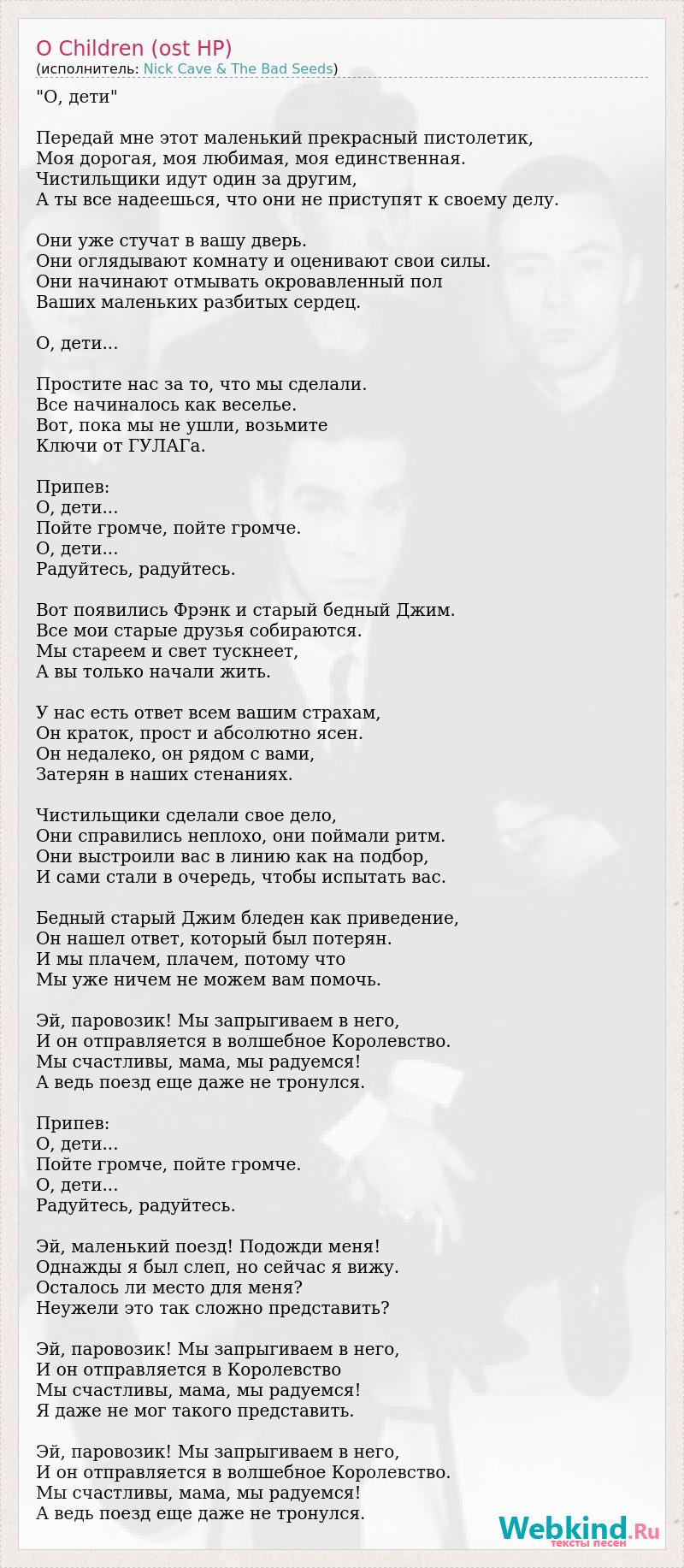 "О, дети" Передай мне этот маленький прекрасный пистолетик, Моя дорогая, моя любимая, моя единственная. Чистильщики идут один за другим, А ты все надеешься, что они не приступят к своему делу. Они уже стучат в вашу дверь. Они оглядывают комнату и оценивают свои силы. Они начинают отмывать окровавленный пол Ваших маленьких разбитых сердец. О, дети... Простите нас за то, что мы сделали. Все начиналось как веселье. Вот, пока мы не ушли, возьмите Ключи от ГУЛАГа. Припев: О, дети... Пойте громче, пойте громче. О, дети... Радуйтесь, радуйтесь. Вот появились Фрэнк и старый бедный Джим. Все мои старые друзья собираются. Мы стареем и свет тускнеет, А вы только начали жить. У нас есть ответ всем вашим страхам, Он краток, прост и абсолютно ясен. Он недалеко, он рядом с вами, Затерян в наших стенаниях. Чистильщики сделали свое дело, Они справились неплохо, они поймали ритм. Они выстроили вас в линию как на подбор, И сами стали в очередь, чтобы испытать вас. Бедный старый Джим бледен как приведение, Он нашел ответ, который был потерян. И мы плачем, плачем, потому что Мы уже ничем не можем вам помочь. Эй, паровозик! Мы запрыгиваем в него, И он отправляется в волшебное Королевство. Мы счастливы, мама, мы радуемся! А ведь поезд еще даже не тронулся. Припев: О, дети... Пойте громче, пойте громче. О, дети... Радуйтесь, радуйтесь. Эй, маленький поезд! Подожди меня! Однажды я был слеп, но сейчас я вижу. Осталось ли место для меня? Неужели это так сложно представить? Эй, паровозик! Мы запрыгиваем в него, И он отправляется в Королевство Мы счастливы, мама, мы радуемся! Я даже не мог такого представить. Эй, паровозик! Мы запрыгиваем в него, И он отправляется в волшебное Королевство. Мы счастливы, мама, мы радуемся! А ведь поезд еще даже не тронулся.