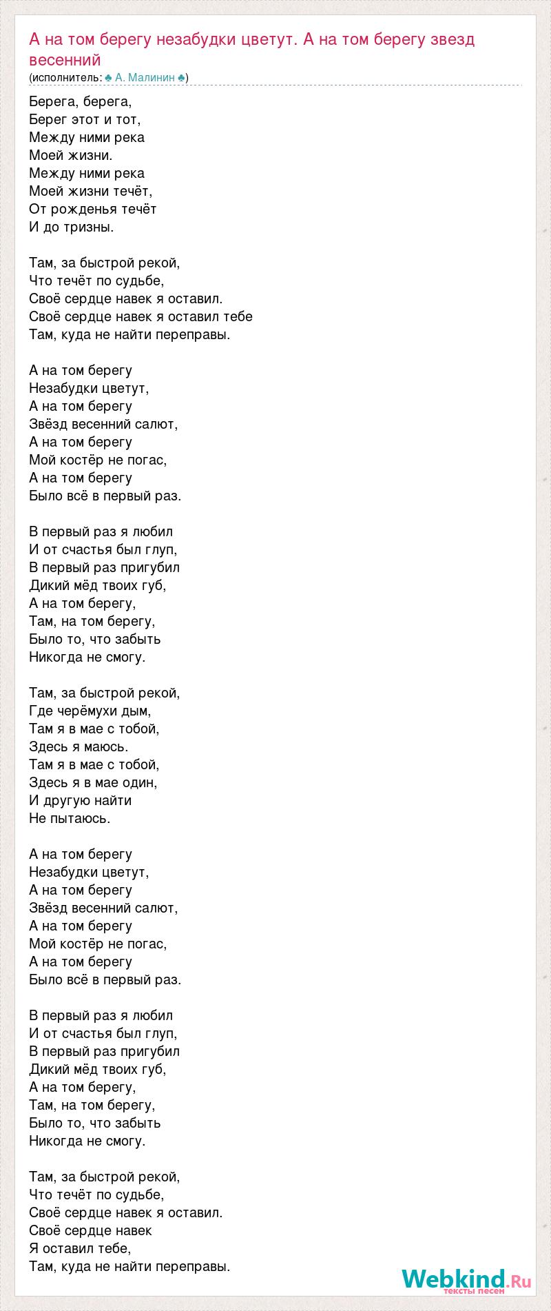 Берега, берега, Берег этот и тот, Между ними река Моей жизни. Между ними река Моей жизни течёт, От рожденья течёт И до тризны. Там, за быстрой рекой, Что течёт по судьбе, Своё сердце навек я оставил. Своё сердце навек я оставил тебе Там, куда не найти переправы. А на том берегу Незабудки цветут, А на том берегу Звёзд весенний салют, А на том берегу Мой костёр не погас, А на том берегу Было всё в первый раз. В первый раз я любил И от счастья был глуп, В первый раз пригубил Дикий мёд твоих губ, А на том берегу, Там, на том берегу, Было то, что забыть Никогда не смогу. Там, за быстрой рекой, Где черёмухи дым, Там я в мае с тобой, Здесь я маюсь. Там я в мае с тобой, Здесь я в мае один, И другую найти Не пытаюсь. А на том берегу Незабудки цветут, А на том берегу Звёзд весенний салют, А на том берегу Мой костёр не погас, А на том берегу Было всё в первый раз. В первый раз я любил И от счастья был глуп, В первый раз пригубил Дикий мёд твоих губ, А на том берегу, Там, на том берегу, Было то, что забыть Никогда не смогу. Там, за быстрой рекой, Что течёт по судьбе, Своё сердце навек я оставил. Своё сердце навек Я оставил тебе, Там, куда не найти переправы.