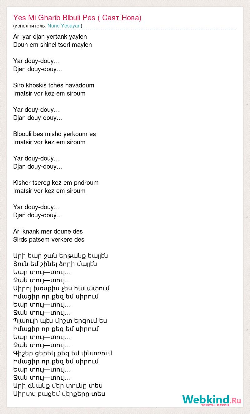 Ari yar djan yertank yaylen Doun em shinel tsori maylen Yar douy-douy… Djan douy-douy… Siro khoskis tches havadoum Imatsir vor kez em siroum Yar douy-douy… Djan douy-douy… Blbouli bes mishd yerkoum es Imatsir vor kez em siroum Yar douy-douy… Djan douy-douy… Kisher tsereg kez em pndroum Imatsir vor kez em siroum Yar douy-douy… Djan douy-douy… Ari knank mer doune des Sirds patsem verkere des Արի եար ջան երթանք եայլէն Տուն եմ շինել ձորի մայլէն Եար տույ—տույ… Ջան տույ—տույ… Սիրոյ խօսքիս չես հաւատում Իմացիր որ քեզ եմ սիրում Եար տույ—տույ… Ջան տույ—տույ… Պլպուլի պէս միշտ երգում ես Իմացիր որ քեզ եմ սիրում Եար տույ—տույ… Ջան տույ—տույ… Գիշեր ցերեկ քեզ եմ փնտռում Իմացիր որ քեզ եմ սիրում Եար տույ—տույ… Ջան տույ—տույ… Արի գնանք մեր տունը տես Սիրտս բացեմ վէրքերը տես