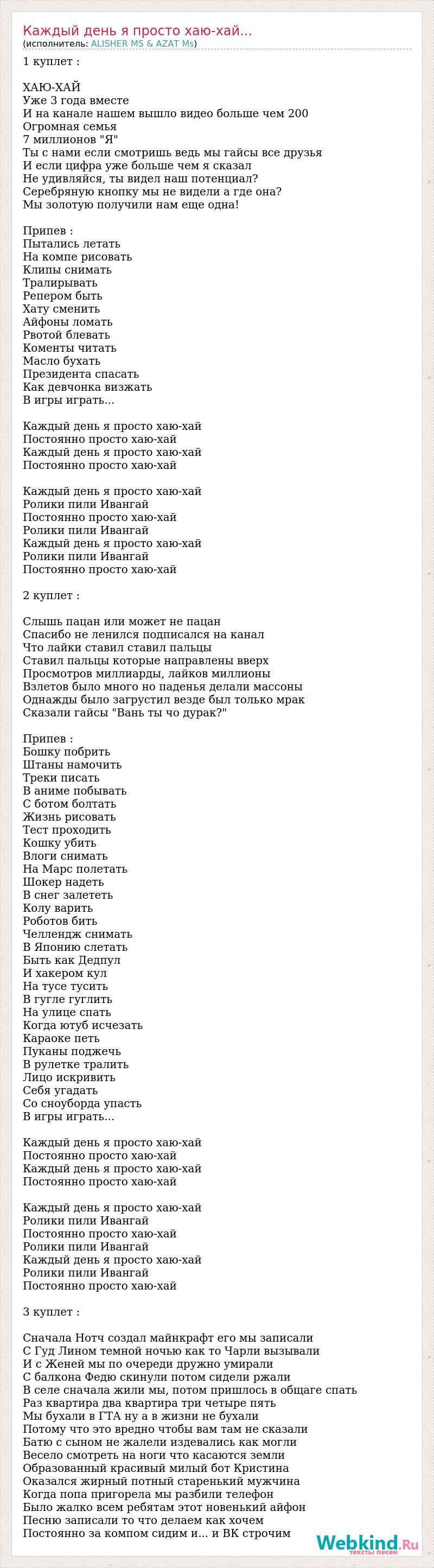 1 куплет : ХАЮ-ХАЙ Уже 3 года вместе И на канале нашем вышло видео больше чем 200 Огромная семья 7 миллионов "Я" Ты с нами если смотришь ведь мы гайсы все друзья И если цифра уже больше чем я сказал Не удивляйся, ты видел наш потенциал? Серебряную кнопку мы не видели а где она? Мы золотую получили нам еще одна! Припев : Пытались летать На компе рисовать Клипы снимать Тралирывать Репером быть Хату сменить Айфоны ломать Рвотой блевать Коменты читать Масло бухать Президента спасать Как девчонка визжать В игры играть... Каждый день я просто хаю-хай Постоянно просто хаю-хай Каждый день я просто хаю-хай Постоянно просто хаю-хай Каждый день я просто хаю-хай Ролики пили Ивангай Постоянно просто хаю-хай Ролики пили Ивангай Каждый день я просто хаю-хай Ролики пили Ивангай Постоянно просто хаю-хай 2 куплет : Слышь пацан или может не пацан Спасибо не ленился подписался на канал Что лайки ставил ставил пальцы Ставил пальцы которые направлены вверх Просмотров миллиарды, лайков миллионы Взлетов было много но паденья делали массоны Однажды было загрустил везде был только мрак Сказали гайсы "Вань ты чо дурак?" Припев : Бошку побрить Штаны намочить Треки писать В аниме побывать С ботом болтать Жизнь рисовать Тест проходить Кошку убить Влоги снимать На Марс полетать Шокер надеть В снег залететь Колу варить Роботов бить Челлендж снимать В Японию слетать Быть как Дедпул И хакером кул На тусе тусить В гугле гуглить На улице спать Когда ютуб исчезать Караоке петь Пуканы поджечь В рулетке тралить Лицо искривить Себя угадать Со сноуборда упасть В игры играть... Каждый день я просто хаю-хай Постоянно просто хаю-хай Каждый день я просто хаю-хай Постоянно просто хаю-хай Каждый день я просто хаю-хай Ролики пили Ивангай Постоянно просто хаю-хай Ролики пили Ивангай Каждый день я просто хаю-хай Ролики пили Ивангай Постоянно просто хаю-хай 3 куплет : Сначала Нотч создал майнкрафт его мы записали С Гуд Лином темной ночью как то Чарли вызывали И с Женей мы по очереди дружно умирали С балкона Федю скинули потом сидели ржали В селе сначала жили мы, потом пришлось в общаге спать Раз квартира два квартира три четыре пять Мы бухали в ГТА ну а в жизни не бухали Потому что это вредно чтобы вам там не сказали Батю с сыном не жалели издевались как могли Весело смотреть на ноги что касаются земли Образованный красивый милый бот Кристина Оказался жирный потный старенький мужчина Когда попа пригорела мы разбили телефон Было жалко всем ребятам этот новенький айфон Песню записали то что делаем как хочем Постоянно за компом сидим и... и ВК строчим