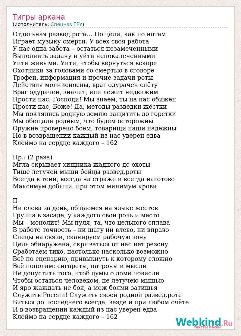 Отдельная развед.рота… По цели, как по нотам Играет музыку смерти. У всех своя работа У нас одна забота – остаться незамеченными Выполнить задачу и уйти непокалеченными Уйти живыми. Уйти, чтобы вернуться вскоре Охотники за головами со смертью в сговоре Трофеи, информация и прочие задачи роты Действия молниеносны, враг одурачен слёту Враг одурачен, значит, или лежит недвижим Прости нас, Господи! Мы знаем, ты на нас обижен Прости нас, Боже! Да, методы разведки жёстки Мы поклялись родную землю защитить до горстки Мы обещали родным, что будем осторожны Оружие проверено боем, товарищи наши надёжны Но в возвращении каждый из нас уверен едва Клеймо на сердце каждого – 162 Пр.: (2 раза) Мгла скрывает хищника жадного до охоты Тише летучей мыши бойцы развед.роты Всегда в тени, всегда на страже и всегда наготове Максимум добычи, при этом минимум крови II Ни слова за день, общаемся на языке жестов Группа в засаде, у каждого свои роль и место Мы – монолит! Мы пуля, та, что цельного сплава В работе точность – ни шагу ни влево, ни вправо Спецы на связи, сканируем рабочую зону Цель обнаружена, скрываться от нас нет резону Сработаем тихо, настолько насколько возможно Всё по сценарию, привыкнуть к которому сложно Всё пополам: сигареты, патроны и мысли Не допустить того, чтоб думы о доме повисли Чтобы остаться человеком, не летучею мышью И яро жаждать не боя, а меж боями затишья Служить России! Служить своей родной развед.роте Биться до последнего всегда, везде и при любом счёте И в возвращении каждый из нас уверен едва Клеймо на сердце каждого – 162