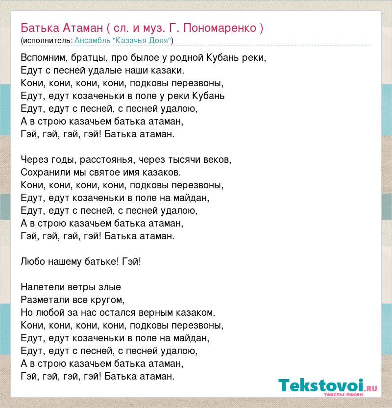 Вспомним, братцы, про былое у родной Кубань реки, Едут с песней удалые наши казаки. Кони, кони, кони, кони, подковы перезвоны, Едут, едут козаченьки в поле у реки Кубань Едут, едут с песней, с песней удалою, А в строю казачьем батька атаман, Гэй, гэй, гэй, гэй! Батька атаман. Через годы, расстоянья, через тысячи веков, Сохранили мы святое имя казаков. Кони, кони, кони, кони, подковы перезвоны, Едут, едут козаченьки в поле на майдан, Едут, едут с песней, с песней удалою, А в строю казачьем батька атаман, Гэй, гэй, гэй, гэй! Батька атаман. Любо нашему батьке! Гэй! Налетели ветры злые Разметали все кругом, Но любой за нас остался верным казаком. Кони, кони, кони, кони, подковы перезвоны, Едут, едут козаченьки в поле на майдан, Едут, едут с песней, с песней удалою, А в строю казачьем батька атаман, Гэй, гэй, гэй, гэй! Батька атаман.