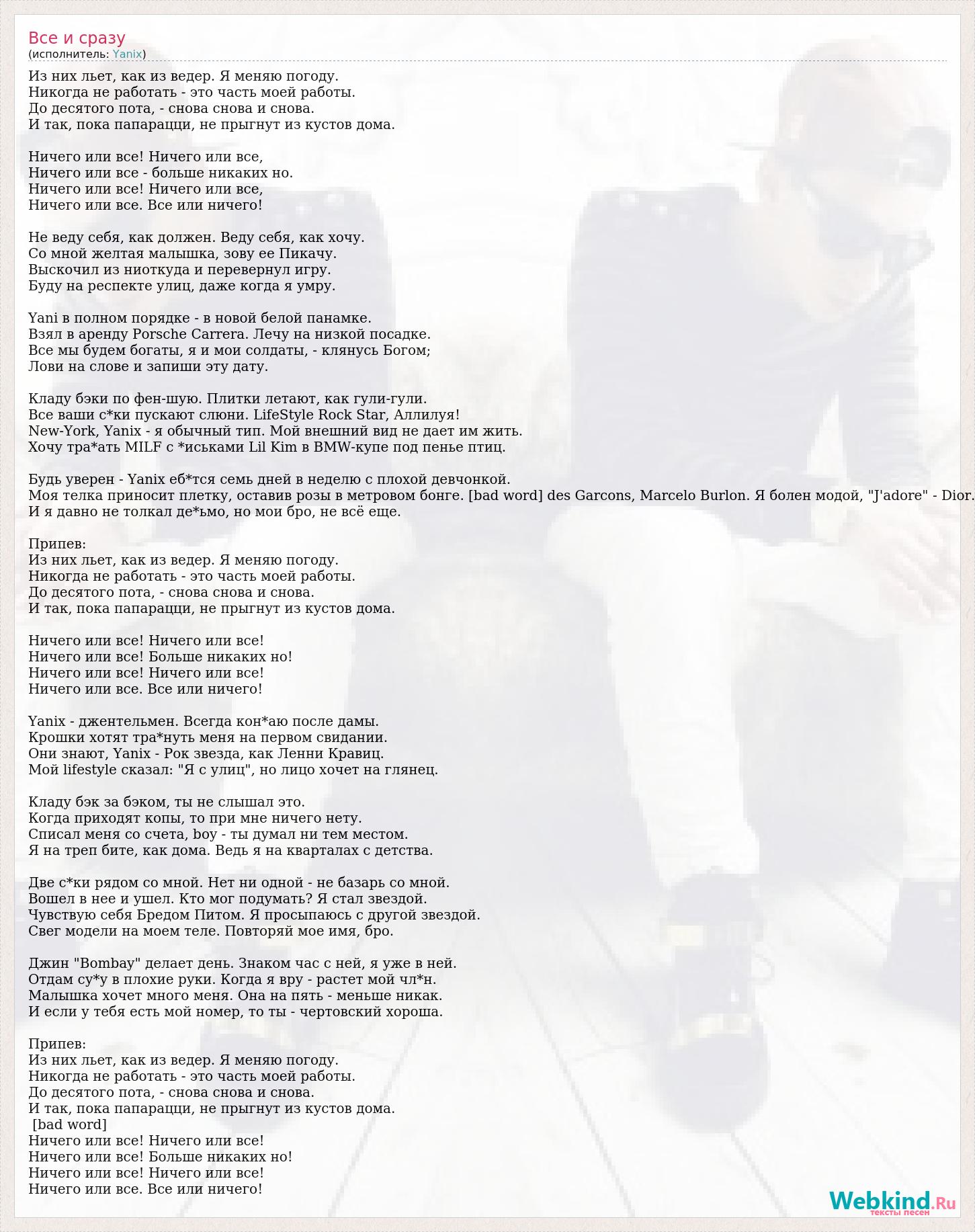 Из них льет, как из ведер. Я меняю погоду. Никогда не работать - это часть моей работы. До десятого пота, - снова снова и снова. И так, пока папарацци, не прыгнут из кустов дома. Ничего или все! Ничего или все, Ничего или все - больше никаких но. Ничего или все! Ничего или все, Ничего или все. Все или ничего! Не веду себя, как должен. Веду себя, как хочу. Со мной желтая малышка, зову ее Пикачу. Выскочил из ниоткуда и перевернул игру. Буду на респекте улиц, даже когда я умру. Yani в полном порядке - в новой белой панамке. Взял в аренду Porsche Carrera. Лечу на низкой посадке. Все мы будем богаты, я и мои солдаты, - клянусь Богом; Лови на слове и запиши эту дату. Кладу бэки по фен-шую. Плитки летают, как гули-гули. Все ваши с*ки пускают слюни. LifeStyle Rock Star, Аллилуя! New-York, Yanix - я обычный тип. Мой внешний вид не дает им жить. Хочу тра*ать MILF с *иськами Lil Kim в BMW-купе под пенье птиц. Будь уверен - Yanix еб*тся семь дней в неделю с плохой девчонкой. Моя телка приносит плетку, оставив розы в метровом бонге. [bad word] des Garcons, Marcelo Burlon. Я болен модой, "J'adore" - Dior. И я давно не толкал де*ьмо, но мои бро, не всё еще. Припев: Из них льет, как из ведер. Я меняю погоду. Никогда не работать - это часть моей работы. До десятого пота, - снова снова и снова. И так, пока папарацци, не прыгнут из кустов дома. Ничего или все! Ничего или все! Ничего или все! Больше никаких но! Ничего или все! Ничего или все! Ничего или все. Все или ничего! Yanix - джентельмен. Всегда кон*аю после дамы. Крошки хотят тра*нуть меня на первом свидании. Они знают, Yanix - Рок звезда, как Ленни Кравиц. Мой lifestyle сказал: "Я с улиц", но лицо хочет на глянец. Кладу бэк за бэком, ты не слышал это. Когда приходят копы, то при мне ничего нету. Списал меня со счета, boy - ты думал ни тем местом. Я на треп бите, как дома. Ведь я на кварталах с детства. Две с*ки рядом со мной. Нет ни одной - не базарь со мной. Вошел в нее и ушел. Кто мог подумать? Я стал звездой. Чувствую себя Бредом Питом. Я просыпаюсь с другой звездой. Свег модели на моем теле. Повторяй мое имя, бро. Джин "Bombay" делает день. Знаком час с ней, я уже в ней. Отдам су*у в плохие руки. Когда я вру - растет мой чл*н. Малышка хочет много меня. Она на пять - меньше никак. И если у тебя есть мой номер, то ты - чертовский хороша. Припев: Из них льет, как из ведер. Я меняю погоду. Никогда не работать - это часть моей работы. До десятого пота, - снова снова и снова. И так, пока папарацци, не прыгнут из кустов дома. [bad word] Ничего или все! Ничего или все! Ничего или все! Больше никаких но! Ничего или все! Ничего или все! Ничего или все. Все или ничего!