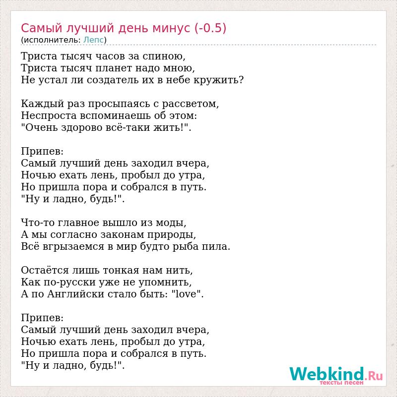 Триста тысяч часов за спиною, Триста тысяч планет надо мною, Не устал ли создатель их в небе кружить? Каждый раз просыпаясь с рассветом, Неспроста вспоминаешь об этом: "Очень здорово всё-таки жить!". Припев: Самый лучший день заходил вчера, Ночью ехать лень, пробыл до утра, Но пришла пора и собрался в путь. "Ну и ладно, будь!". Что-то главное вышло из моды, А мы согласно законам природы, Всё вгрызаемся в мир будто рыба пила. Остаётся лишь тонкая нам нить, Как по-русски уже не упомнить, А по Английски стало быть: "love". Припев: Самый лучший день заходил вчера, Ночью ехать лень, пробыл до утра, Но пришла пора и собрался в путь. "Ну и ладно, будь!".
