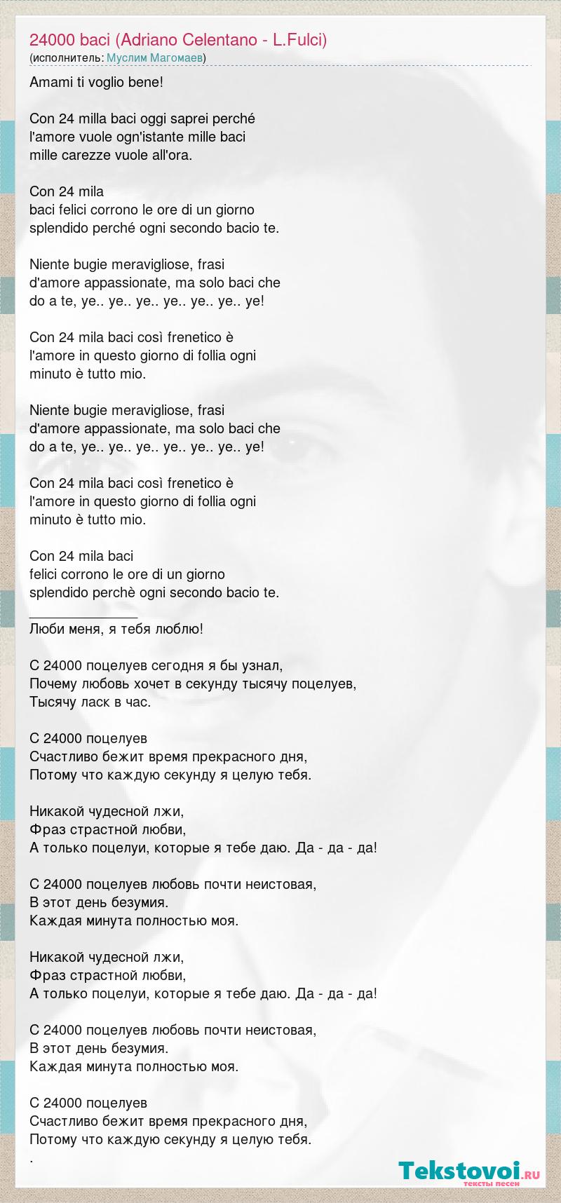 Amami ti voglio bene! Con 24 milla baci oggi saprei perché l'amore vuole ogn'istante mille baci mille carezze vuole all'ora. Con 24 mila baci felici corrono le ore di un giorno splendido perché ogni secondo bacio te. Niente bugie meravigliose, frasi d'amore appassionate, ma solo baci che do a te, ye.. ye.. ye.. ye.. ye.. ye.. ye! Con 24 mila baci così frenetico è l'amore in questo giorno di follia ogni minuto è tutto mio. Niente bugie meravigliose, frasi d'amore appassionate, ma solo baci che do a te, ye.. ye.. ye.. ye.. ye.. ye.. ye! Con 24 mila baci così frenetico è l'amore in questo giorno di follia ogni minuto è tutto mio. Con 24 mila baci felici corrono le ore di un giorno splendido perchè ogni secondo bacio te. ______________ Люби меня, я тебя люблю! С 24000 поцелуев cегодня я бы узнал, Почему любовь хочет в секунду тысячу поцелуев, Тысячу ласк в час. С 24000 поцелуев Счастливо бежит время прекрасного дня, Потому что каждую секунду я целую тебя. Никакой чудесной лжи, Фраз страстной любви, А только поцелуи, которые я тебе даю. Да - да - да! С 24000 поцелуев любовь почти неистовая, В этот день безумия. Каждая минута полностью моя. Никакой чудесной лжи, Фраз страстной любви, А только поцелуи, которые я тебе даю. Да - да - да! С 24000 поцелуев любовь почти неистовая, В этот день безумия. Каждая минута полностью моя. С 24000 поцелуев Счастливо бежит время прекрасного дня, Потому что каждую секунду я целую тебя. .