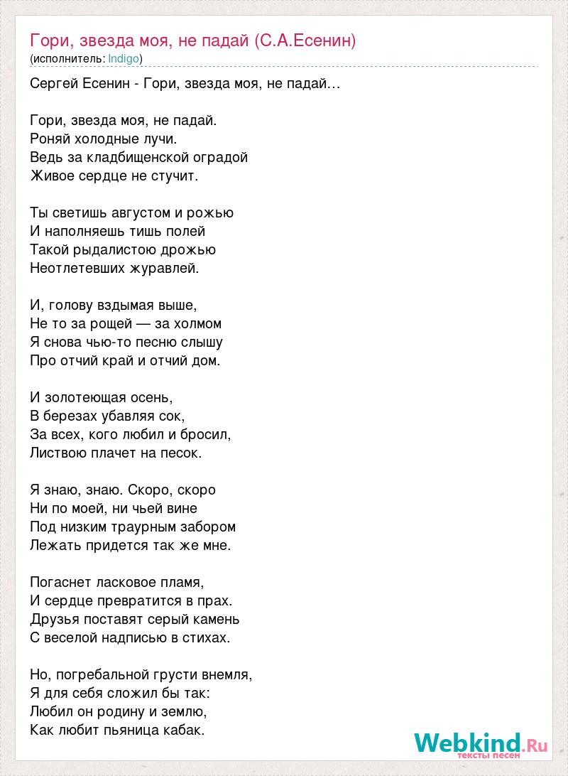 А как ты думаешь, о чем песня "Гори, звезда моя, не падай (С.А.Есенин)" ?