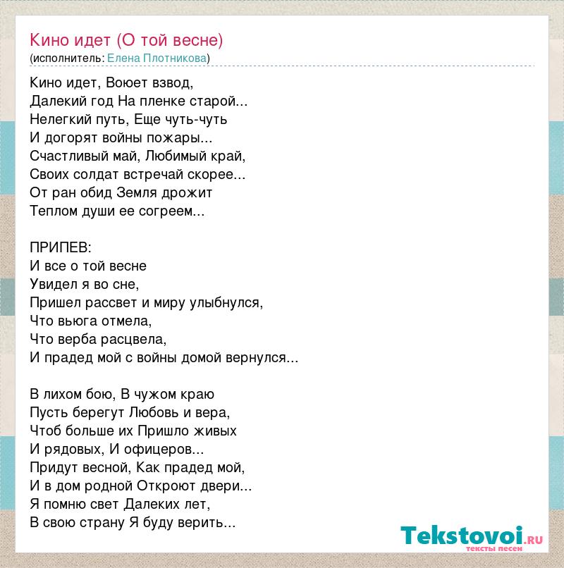 Кино идет, Воюет взвод, Далекий год На пленке старой... Нелегкий путь, Еще чуть-чуть И догорят войны пожары... Счастливый май, Любимый край, Своих солдат встречай скорее... От ран обид Земля дрожит Теплом души ее согреем... ПРИПЕВ: И все о той весне Увидел я во сне, Пришел рассвет и миру улыбнулся, Что вьюга отмела, Что верба расцвела, И прадед мой с войны домой вернулся... В лихом бою, В чужом краю Пусть берегут Любовь и вера, Чтоб больше их Пришло живых И рядовых, И офицеров... Придут весной, Как прадед мой, И в дом родной Откроют двери... Я помню свет Далеких лет, В свою страну Я буду верить...