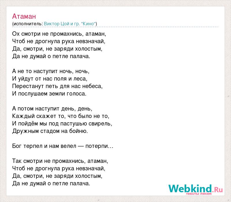 Ох смотри не промахнись, атаман, Чтоб не дрогнула рука невзначай, Да, смотри, не заряди холостым, Да не думай о петле палача. А не то наступит ночь, ночь, И уйдут от нас поля и леса, Перестанут петь для нас небеса, И послушаем земли голоса. А потом наступит день, день, Каждый скажет то, что было не то, И пойдём мы под пастушью свирель, Дружным стадом на бойню. Бог терпел и нам велел — потерпи… Так смотри не промахнись, атаман, Чтоб не дрогнула рука невзначай, Да, смотри, не заряди холостым, Да не думай о петле палача.