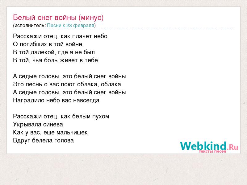 Расcкажи отец, как плачет небо О погибших в той войне В той далекой, где я не был В той, чья боль живет в тебе А седые головы, это белый снег войны Это песнь о вас поют облака, облака А седые головы, это белый снег войны Наградило небо вас навсегда Расcкажи отец, как белым пухом Укрывала синева Как у вас, еще мальчишек Вдруг белела голова