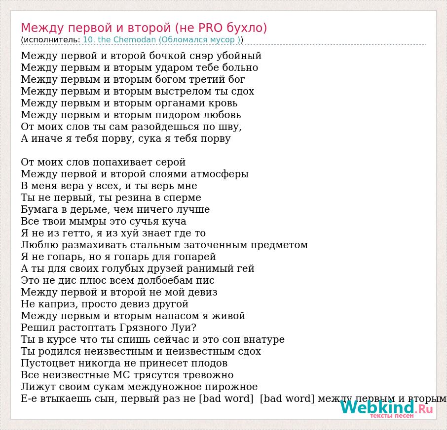 Между первой и второй бочкой снэр убойный Между первым и вторым ударом тебе больно Между первым и вторым богом третий бог Между первым и вторым выстрелом ты сдох Между первым и вторым органами кровь Между первым и вторым пидором любовь От моих слов ты сам разойдешься по шву, А иначе я тебя порву, сука я тебя порву От моих слов попахивает серой Между первой и второй слоями атмосферы В меня вера у всех, и ты верь мне Ты не первый, ты резина в сперме Бумага в дерьме, чем ничего лучше Все твои мымры это сучья куча Я не из гетто, я из хуй знает где то Люблю размахивать стальным заточенным предметом Я не гопарь, но я гопарь для гопарей А ты для своих голубых друзей ранимый гей Это не дис плюс всем долбоебам пис Между первой и второй не мой девиз Не каприз, просто девиз другой Между первым и вторым напасом я живой Решил растоптать Грязного Луи? Ты в курсе что ты спишь сейчас и это сон внатуре Ты родился неизвестным и неизвестным сдох Пустоцвет никогда не принесет плодов Все неизвестные МС трясутся тревожно Лижут своим сукам междуножное пирожное Е-е втыкаешь сын, первый раз не [bad word] [bad word] между первым и вторым