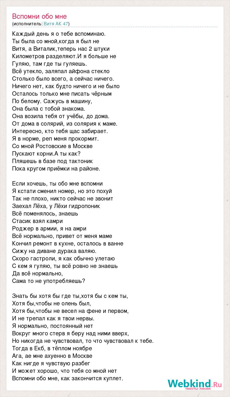 Каждый день я о тебе вспоминаю. Ты была со мной,когда я был не Витя, а Виталик,теперь нас 2 штуки Километров разделяют.И я больше не Гуляю, там где ты гуляешь. Всё утекло, заляпал айфона стекло Столько было всего, а сейчас ничего. Ничего нет, как будто ничего и не было Осталось только мне писать чёрным По белому. Сажусь в машину, Она была с тобой знакома. Она возила тебя от учёбы, до дома. От дома в солярий, из солярия к маме. Интересно, кто тебя щас забирает. Я в норме, реп меня прокормит. Со мной Ростовские в Москве Пускают корни.А ты как? Пляшешь в базе под тактоник Пока кругом приёмки на районе. Если хочешь, ты обо мне вспомни Я кстати сменил номер, но это похуй Так не плохо, никто сейчас не звонит Заехал Лёха, у Лёхи гидропоник Всё поменялось, знаешь Стасик взял камри Роджер в армии, я на амри Всё нормально, привет от меня маме Кончил ремонт в кухне, осталось в ванне Сижу на диване дурака валяю. Скоро гастроли, я как обычно улетаю С кем я гуляю, ты всё ровно не знаешь Да всё нормально, Сама то не употребляешь? Знать бы хотя бы где ты,хотя бы с кем ты, Хотя бы,чтобы не олень был, Хотя бы,чтобы не весел на фене и первом, И не трепал как я твои нервы. Я нормально, постоянный нет Вокруг много стерв я беру над ними вверх, Но никогда не чувствовал, то что чувствовал к тебе. Тогда в Екб, в тёплом ноябре Ага, ае мне ахуенно в Москве Как нигде я чувствую разбег И может хорошо, что тебя со мной нет Вспомни обо мне, как закончится куплет.