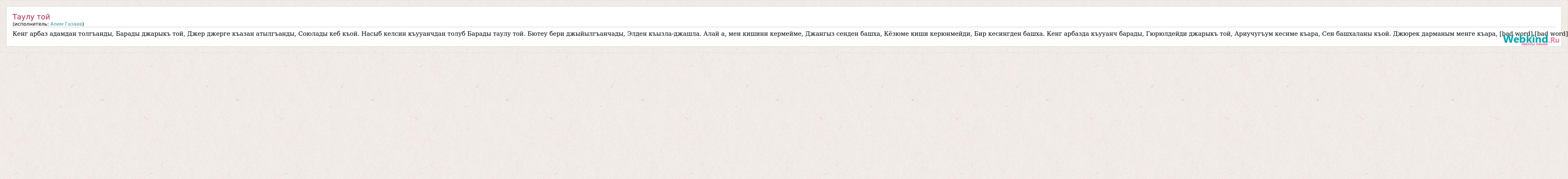 Кенг арбаз адамдан толгъанды, Барады джарыкъ той, Джер джерге къазан атылгъанды, Союлады кеб къой. Насыб келсин къууанчдан толуб Барады таулу той. Бютеу бери джыйылгъанчады, Элден къызла-джашла. Алай а, мен кишини кермейме, Джангыз сенден башха, Кёзюме киши керюнмейди, Бир кесингден башха. Кенг арбазда къууанч барады, Гюрюлдейди джарыкъ той, Ариучугъум кесиме къара, Сен башхаланы къой. Джюрек дарманым менге къара, [bad word] [bad word]