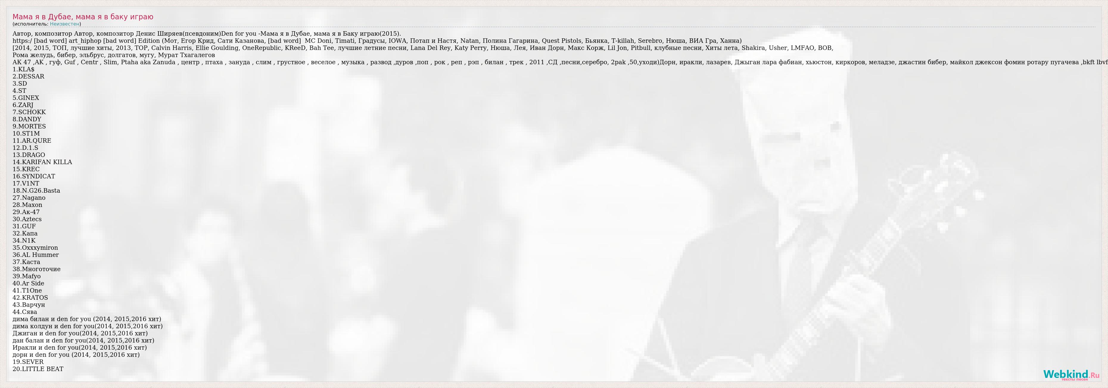 Автор, композитор Автор, композитор Денис Ширяев(псевдоним)Den for you -Мама я в Дубае, мама я в Баку играю(2015). https:/ [bad word] art_hiphop [bad word] Edition (Мот, Егор Крид, Сати Казанова, [bad word] MC Doni, Timati, Градусы, IOWA, Потап и Настя, Natan, Полина Гагарина, Quest Pistols, Бьянка, T-killah, Serebro, Нюша, ВИА Гра, Ханна) [2014, 2015, ТОП, лучшие хиты, 2013, TOP, Calvin Harris, Ellie Goulding, OneRepublic, KReeD, Bah Tee, лучшие летние песни, Lana Del Rey, Katy Perry, Нюша, Лея, Иван Дорн, Макс Корж, Lil Jon, Pitbull, клубные песни, Хиты лета, Shakira, Usher, LMFAO, BOB, Рома желудь, бибер, эльбрус, долгатов, мугу, Мурат Тхагалегов АК 47 ,AK , гуф, Guf , Centr , Slim, Ptaha aka Zanuda , центр , птаха , зануда , слим , грустное , веселое , музыка , развод ,дуров ,поп , рок , реп , рэп , билан , трек , 2011 ,СД ,песни,серебро, 2pak ,50,уходи)Дорн, иракли, лазарев, Джыган лара фабиан, хьюстон, киркоров, меладзе, джастин бибер, майкол джексон фомин ротару пугачева ,bkft lbvf 1.KLA$ 2.DESSAR 3.SD 4.ST 5.GINEX 6.ZARJ 7.SCHOKK 8.DANDY 9.MORTES 10.ST1M 11.AR.QURE 12.D.1.S 13.DRAGO 14.KARIFAN KILLA 15.KREC 16.SYNDICAT 17.V1NT 18.N.G26.Basta 27.Nagano 28.Maxon 29.Ак-47 30.Aztecs 31.GUF 32.Капа 34.N1K 35.Oxxxymiron 36.AL Hummer 37.Каста 38.Многоточие 39.Mafyo 40.Ar Side 41.T1One 42.KRATOS 43.Варчун 44.Сява дима билан и den for you (2014, 2015,2016 хит) дима колдун и den for you(2014, 2015,2016 хит) Джиган и den for you(2014, 2015,2016 хит) дан балан и den for you(2014, 2015,2016 хит) Иракли и den for you(2014, 2015,2016 хит) дорн и den for you (2014, 2015,2016 хит) 19.SEVER 20.LITTLE BEAT