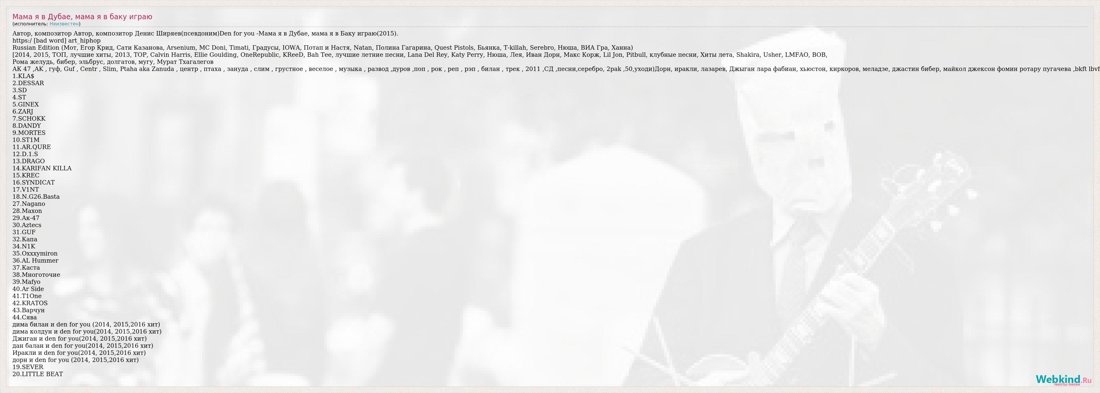 Автор, композитор Автор, композитор Денис Ширяев(псевдоним)Den for you -Мама я в Дубае, мама я в Баку играю(2015). https:/ [bad word] art_hiphop Russian Edition (Мот, Егор Крид, Сати Казанова, Arsenium, MC Doni, Timati, Градусы, IOWA, Потап и Настя, Natan, Полина Гагарина, Quest Pistols, Бьянка, T-killah, Serebro, Нюша, ВИА Гра, Ханна) [2014, 2015, ТОП, лучшие хиты, 2013, TOP, Calvin Harris, Ellie Goulding, OneRepublic, KReeD, Bah Tee, лучшие летние песни, Lana Del Rey, Katy Perry, Нюша, Лея, Иван Дорн, Макс Корж, Lil Jon, Pitbull, клубные песни, Хиты лета, Shakira, Usher, LMFAO, BOB, Рома желудь, бибер, эльбрус, долгатов, мугу, Мурат Тхагалегов АК 47 ,AK , гуф, Guf , Centr , Slim, Ptaha aka Zanuda , центр , птаха , зануда , слим , грустное , веселое , музыка , развод ,дуров ,поп , рок , реп , рэп , билан , трек , 2011 ,СД ,песни,серебро, 2pak ,50,уходи)Дорн, иракли, лазарев, Джыган лара фабиан, хьюстон, киркоров, меладзе, джастин бибер, майкол джексон фомин ротару пугачева ,bkft lbvf 1.KLA$ 2.DESSAR 3.SD 4.ST 5.GINEX 6.ZARJ 7.SCHOKK 8.DANDY 9.MORTES 10.ST1M 11.AR.QURE 12.D.1.S 13.DRAGO 14.KARIFAN KILLA 15.KREC 16.SYNDICAT 17.V1NT 18.N.G26.Basta 27.Nagano 28.Maxon 29.Ак-47 30.Aztecs 31.GUF 32.Капа 34.N1K 35.Oxxxymiron 36.AL Hummer 37.Каста 38.Многоточие 39.Mafyo 40.Ar Side 41.T1One 42.KRATOS 43.Варчун 44.Сява дима билан и den for you (2014, 2015,2016 хит) дима колдун и den for you(2014, 2015,2016 хит) Джиган и den for you(2014, 2015,2016 хит) дан балан и den for you(2014, 2015,2016 хит) Иракли и den for you(2014, 2015,2016 хит) дорн и den for you (2014, 2015,2016 хит) 19.SEVER 20.LITTLE BEAT