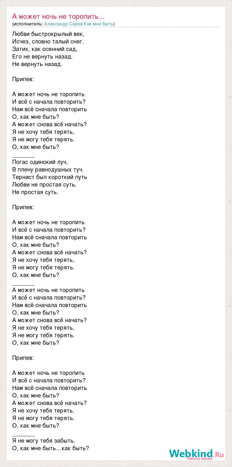 Любви быстрокрылый век, Исчез, словно талый снег. Затих, как осенний сад, Его не вернуть назад. Не вернуть назад. Припев: А может ночь не торопить И всё с начала повторить? Нам всё сначала повторить О, как мне быть? А может снова всё начать? Я не хочу тебя терять, Я не могу тебя терять. О, как мне быть? _______ Погас одинокий луч, В плену равнодушных туч. Тернист был короткий путь Любви не простая суть. Не простая суть. Припев: А может ночь не торопить И всё с начала повторить? Нам всё сначала повторить О, как мне быть? А может снова всё начать? Я не хочу тебя терять, Я не могу тебя терять. О, как мне быть? _______ А может ночь не торопить И всё с начала повторить? Нам всё сначала повторить О, как мне быть? А может снова всё начать? Я не хочу тебя терять, Я не могу тебя терять. О, как мне быть? Припев: А может ночь не торопить И всё с начала повторить? Нам всё сначала повторить О, как мне быть? А может снова всё начать? Я не хочу тебя терять, Я не могу тебя терять. О, как мне быть? _______ Я не могу тебя забыть. О, как мне быть…как быть?