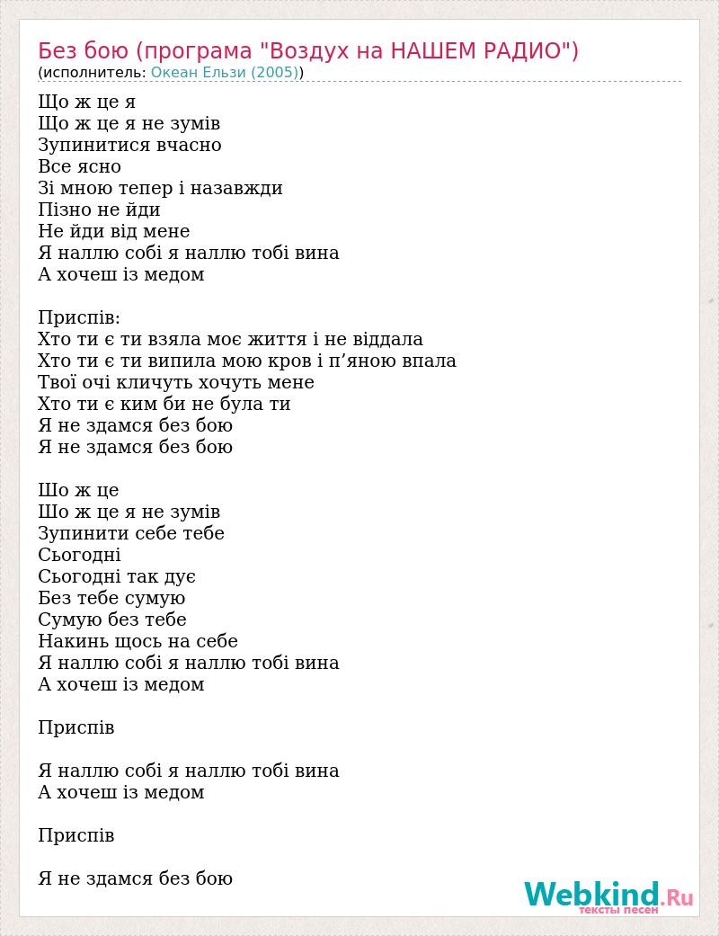 Що ж це я Що ж це я не зумів Зупинитися вчасно Все ясно Зі мною тепер і назавжди Пізно не йди Не йди від мене Я наллю собі я наллю тобі вина А хочеш із медом Приспів: Хто ти є ти взяла моє життя і не віддала Хто ти є ти випила мою кров і п’яною впала Твої очі кличуть хочуть мене Хто ти є ким би не була ти Я не здамся без бою Я не здамся без бою Шо ж це Шо ж це я не зумів Зупинити себе тебе Сьогодні Сьогодні так дує Без тебе сумую Сумую без тебе Накинь щось на себе Я наллю собі я наллю тобі вина А хочеш із медом Приспів Я наллю собі я наллю тобі вина А хочеш із медом Приспів Я не здамся без бою