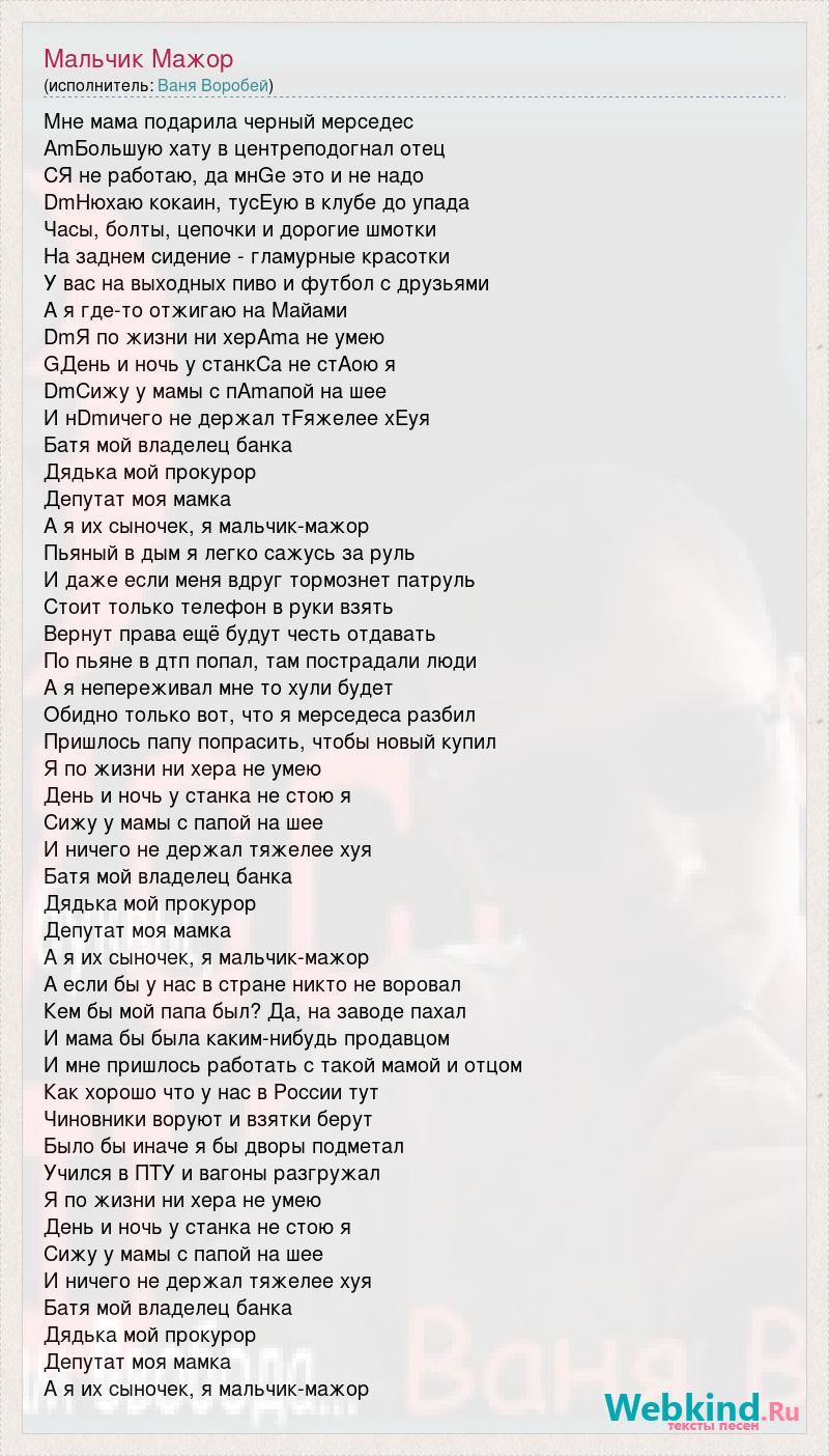 Мне мама подарила черный мерседес AmБольшую хату в центреподогнал отец CЯ не работаю, да мнGе это и не надо DmНюхаю кокаин, тусEую в клубе до упада Часы, болты, цепочки и дорогие шмотки На заднем сидение - гламурные красотки У вас на выходных пиво и футбол с друзьями А я где-то отжигаю на Майами DmЯ по жизни ни херAmа не умею GДень и ночь у станкCа не стAою я DmСижу у мамы с пAmапой на шее И нDmичего не держал тFяжелее хEуя Батя мой владелец банка Дядька мой прокурор Депутат моя мамка А я их сыночек, я мальчик-мажор Пьяный в дым я легко сажусь за руль И даже если меня вдруг тормознет патруль Стоит только телефон в руки взять Вернут права ещё будут честь отдавать По пьяне в дтп попал, там пострадали люди А я непереживал мне то хули будет Обидно только вот, что я мерседеса разбил Пришлось папу попрасить, чтобы новый купил Я по жизни ни хера не умею День и ночь у станка не стою я Cижу у мамы с папой на шее И ничего не держал тяжелее хуя Батя мой владелец банка Дядька мой прокурор Депутат моя мамка А я их сыночек, я мальчик-мажор А если бы у нас в стране никто не воровал Кем бы мой папа был? Да, на заводе пахал И мама бы была каким-нибудь продавцом И мне пришлось работать с такой мамой и отцом Как хорошо что у нас в России тут Чиновники воруют и взятки берут Было бы иначе я бы дворы подметал Учился в ПТУ и вагоны разгружал Я по жизни ни хера не умею День и ночь у станка не стою я Cижу у мамы с папой на шее И ничего не держал тяжелее хуя Батя мой владелец банка Дядька мой прокурор Депутат моя мамка А я их сыночек, я мальчик-мажор