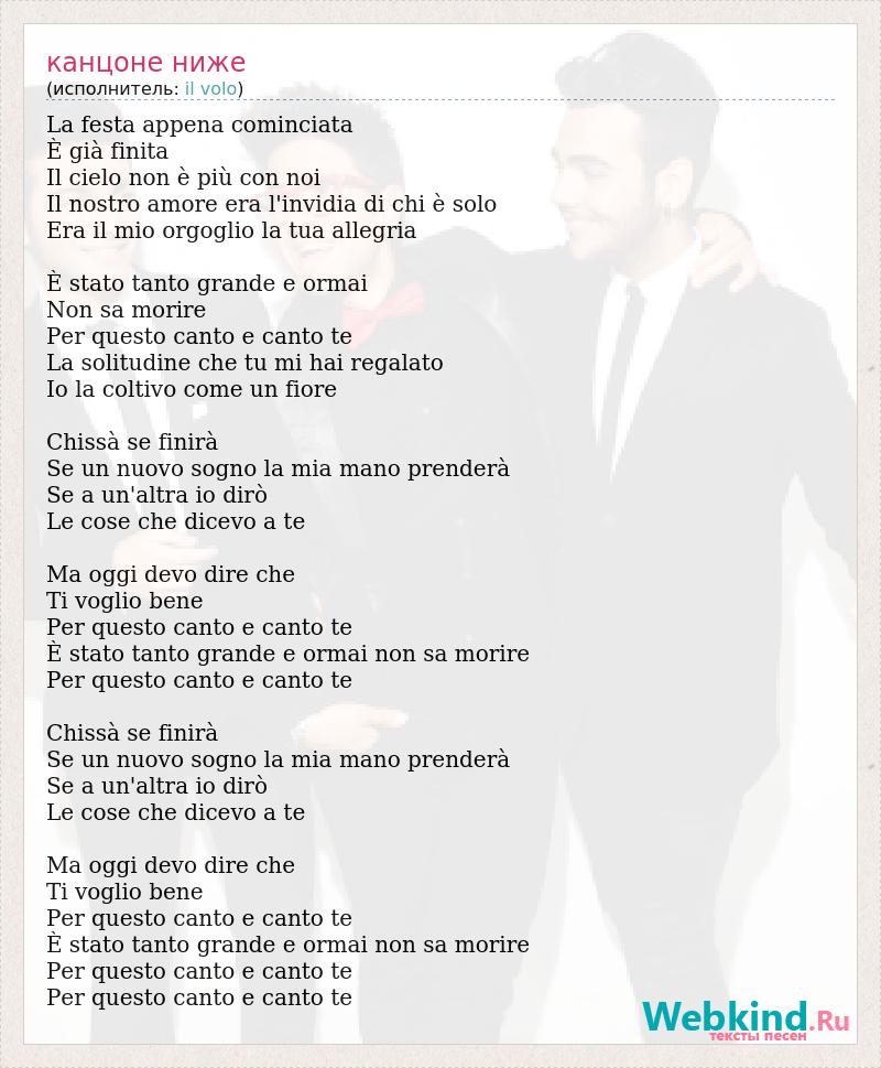 La festa appena cominciata È già finita Il cielo non è più con noi Il nostro amore era l'invidia di chi è solo Era il mio orgoglio la tua allegria È stato tanto grande e ormai Non sa morire Per questo canto e canto te La solitudine che tu mi hai regalato Io la coltivo come un fiore Chissà se finirà Se un nuovo sogno la mia mano prenderà Se a un'altra io dirò Le cose che dicevo a te Ma oggi devo dire che Ti voglio bene Per questo canto e canto te È stato tanto grande e ormai non sa morire Per questo canto e canto te Chissà se finirà Se un nuovo sogno la mia mano prenderà Se a un'altra io dirò Le cose che dicevo a te Ma oggi devo dire che Ti voglio bene Per questo canto e canto te È stato tanto grande e ormai non sa morire Per questo canto e canto te Per questo canto e canto te