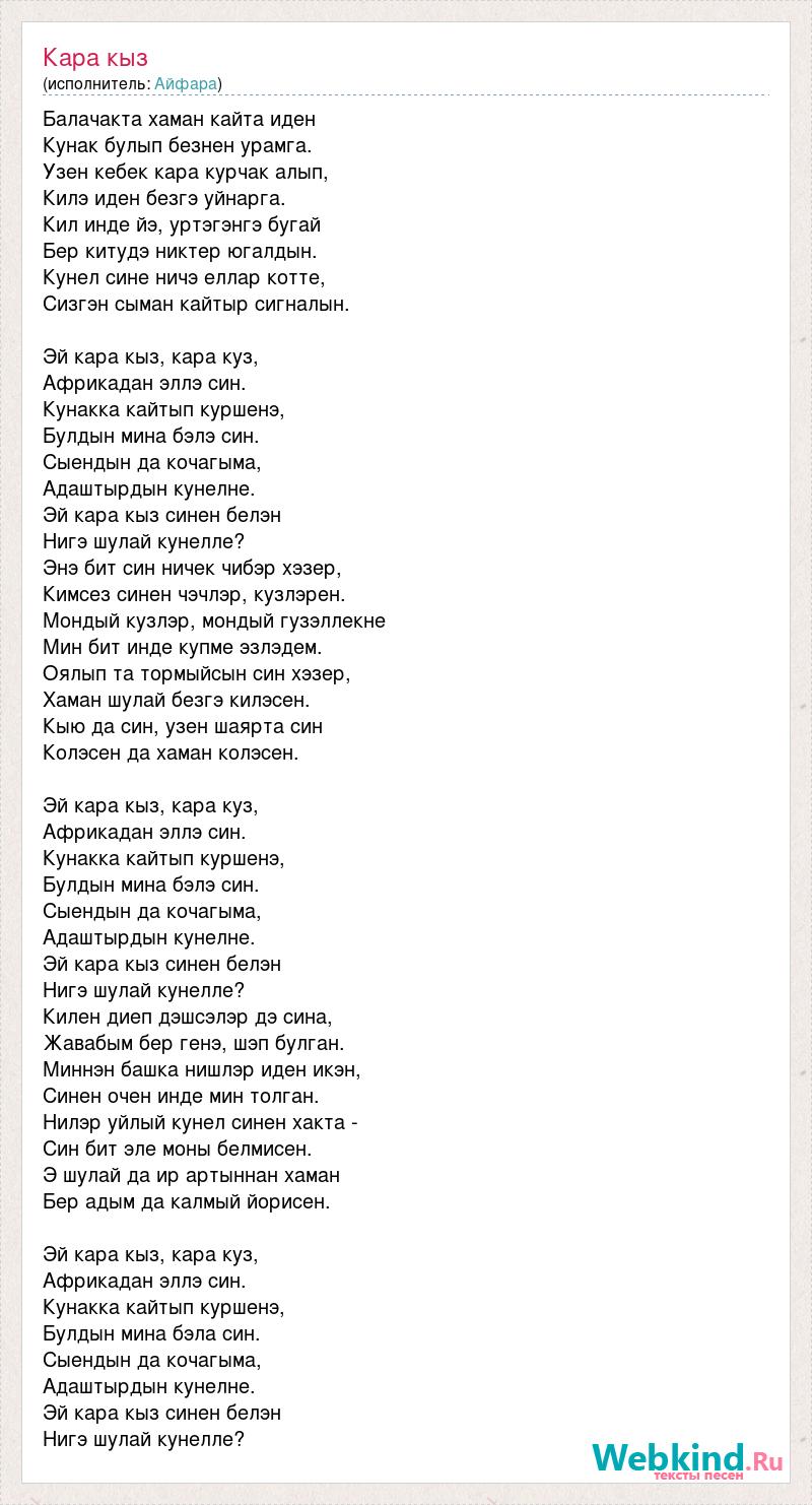 Балачакта хаман кайта иден Кунак булып безнен урамга. Узен кебек кара курчак алып, Килэ иден безгэ уйнарга. Кил инде йэ, уртэгэнгэ бугай Бер китудэ никтер югалдын. Кунел сине ничэ еллар котте, Сизгэн сыман кайтыр сигналын. Эй кара кыз, кара куз, Африкадан эллэ син. Кунакка кайтып куршенэ, Булдын мина бэлэ син. Сыендын да кочагыма, Адаштырдын кунелне. Эй кара кыз синен белэн Нигэ шулай кунелле? Энэ бит син ничек чибэр хэзер, Кимсез синен чэчлэр, кузлэрен. Мондый кузлэр, мондый гузэллекне Мин бит инде купме эзлэдем. Оялып та тормыйсын син хэзер, Хаман шулай безгэ килэсен. Кыю да син, узен шаярта син Колэсен да хаман колэсен. Эй кара кыз, кара куз, Африкадан эллэ син. Кунакка кайтып куршенэ, Булдын мина бэлэ син. Сыендын да кочагыма, Адаштырдын кунелне. Эй кара кыз синен белэн Нигэ шулай кунелле? Килен диеп дэшсэлэр дэ сина, Жавабым бер генэ, шэп булган. Миннэн башка нишлэр иден икэн, Синен очен инде мин толган. Нилэр уйлый кунел синен хакта - Син бит эле моны белмисен. Э шулай да ир артыннан хаман Бер адым да калмый йорисен. Эй кара кыз, кара куз, Африкадан эллэ син. Кунакка кайтып куршенэ, Булдын мина бэла син. Сыендын да кочагыма, Адаштырдын кунелне. Эй кара кыз синен белэн Нигэ шулай кунелле?