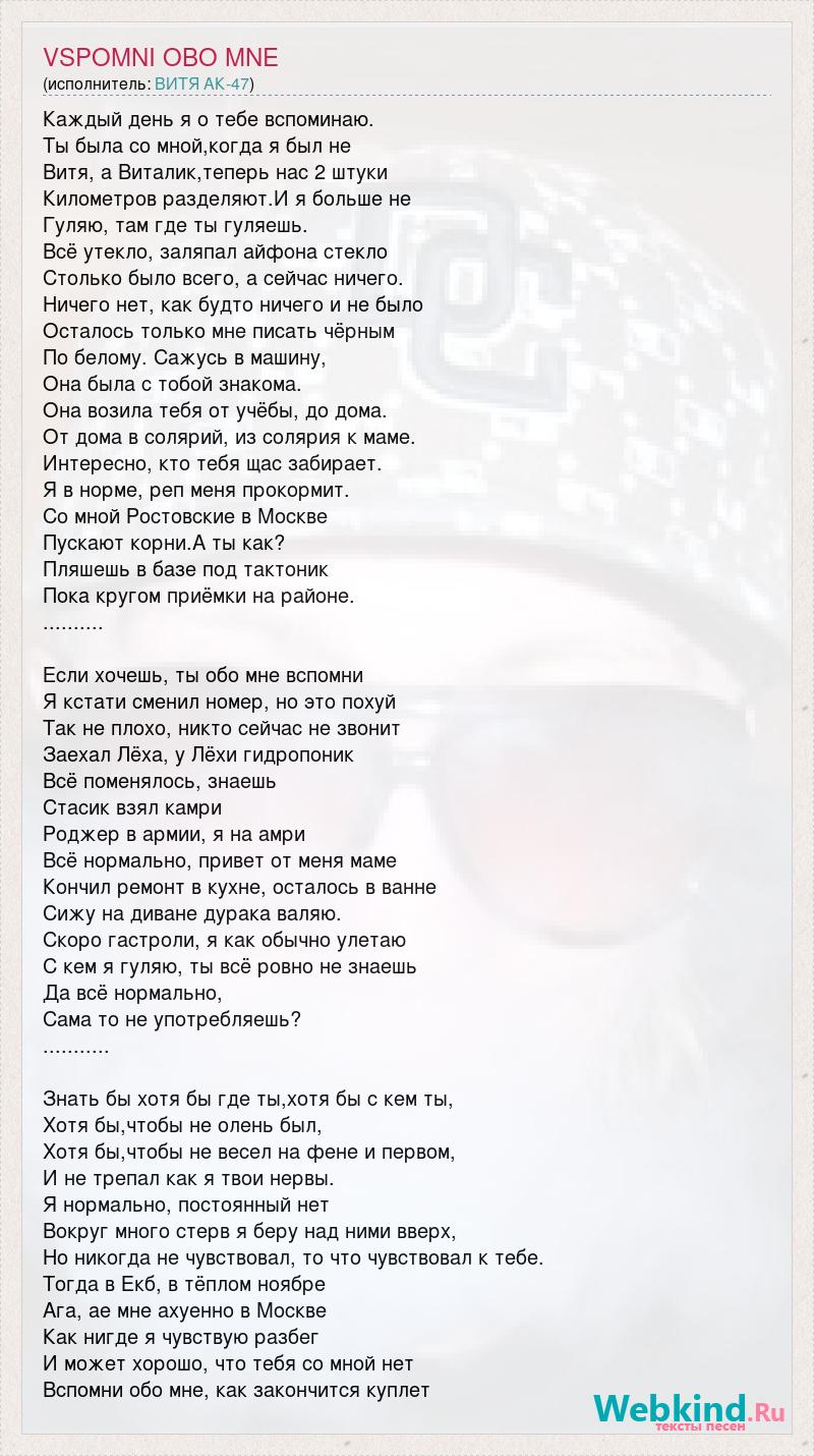 Каждый день я о тебе вспоминаю. Ты была со мной,когда я был не Витя, а Виталик,теперь нас 2 штуки Километров разделяют.И я больше не Гуляю, там где ты гуляешь. Всё утекло, заляпал айфона стекло Столько было всего, а сейчас ничего. Ничего нет, как будто ничего и не было Осталось только мне писать чёрным По белому. Сажусь в машину, Она была с тобой знакома. Она возила тебя от учёбы, до дома. От дома в солярий, из солярия к маме. Интересно, кто тебя щас забирает. Я в норме, реп меня прокормит. Со мной Ростовские в Москве Пускают корни.А ты как? Пляшешь в базе под тактоник Пока кругом приёмки на районе. .......... Если хочешь, ты обо мне вспомни Я кстати сменил номер, но это похуй Так не плохо, никто сейчас не звонит Заехал Лёха, у Лёхи гидропоник Всё поменялось, знаешь Стасик взял камри Роджер в армии, я на амри Всё нормально, привет от меня маме Кончил ремонт в кухне, осталось в ванне Сижу на диване дурака валяю. Скоро гастроли, я как обычно улетаю С кем я гуляю, ты всё ровно не знаешь Да всё нормально, Сама то не употребляешь? ........... Знать бы хотя бы где ты,хотя бы с кем ты, Хотя бы,чтобы не олень был, Хотя бы,чтобы не весел на фене и первом, И не трепал как я твои нервы. Я нормально, постоянный нет Вокруг много стерв я беру над ними вверх, Но никогда не чувствовал, то что чувствовал к тебе. Тогда в Екб, в тёплом ноябре Ага, ае мне ахуенно в Москве Как нигде я чувствую разбег И может хорошо, что тебя со мной нет Вспомни обо мне, как закончится куплет
