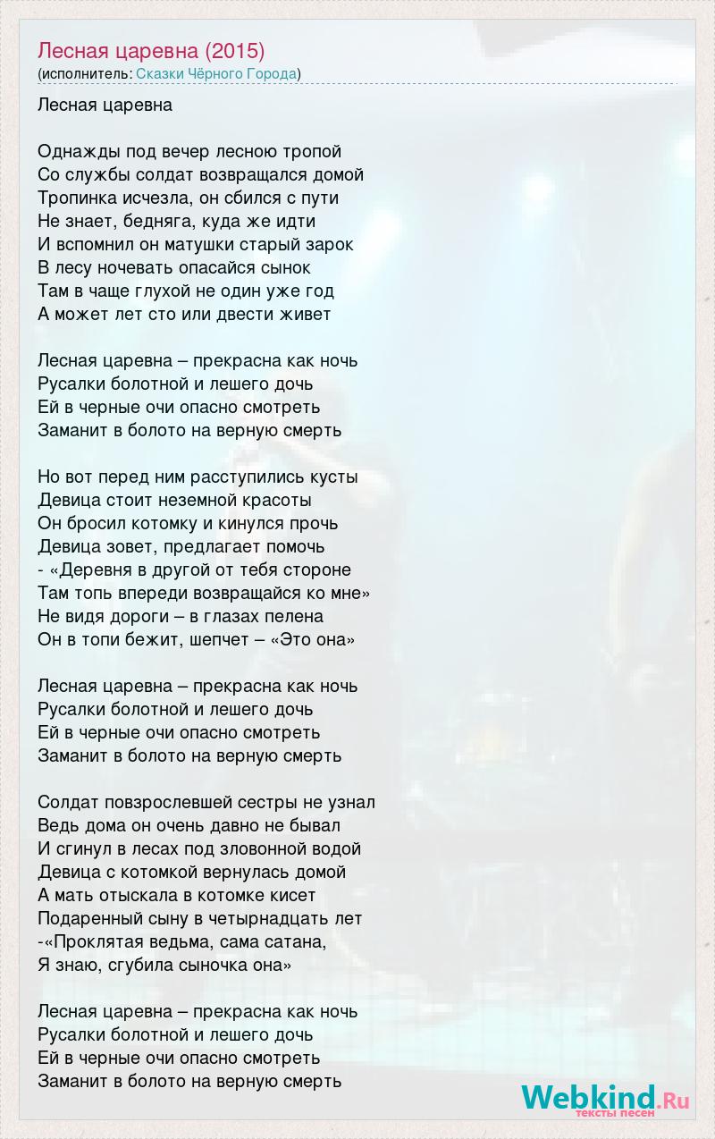 Лесная царевна Однажды под вечер лесною тропой Со службы солдат возвращался домой Тропинка исчезла, он сбился с пути Не знает, бедняга, куда же идти И вспомнил он матушки старый зарок В лесу ночевать опасайся сынок Там в чаще глухой не один уже год А может лет сто или двести живет Лесная царевна – прекрасна как ночь Русалки болотной и лешего дочь Ей в черные очи опасно смотреть Заманит в болото на верную смерть Но вот перед ним расступились кусты Девица стоит неземной красоты Он бросил котомку и кинулся прочь Девица зовет, предлагает помочь - «Деревня в другой от тебя стороне Там топь впереди возвращайся ко мне» Не видя дороги – в глазах пелена Он в топи бежит, шепчет – «Это она» Лесная царевна – прекрасна как ночь Русалки болотной и лешего дочь Ей в черные очи опасно смотреть Заманит в болото на верную смерть Солдат повзрослевшей сестры не узнал Ведь дома он очень давно не бывал И сгинул в лесах под зловонной водой Девица с котомкой вернулась домой А мать отыскала в котомке кисет Подаренный сыну в четырнадцать лет -«Проклятая ведьма, сама сатана, Я знаю, сгубила сыночка она» Лесная царевна – прекрасна как ночь Русалки болотной и лешего дочь Ей в черные очи опасно смотреть Заманит в болото на верную смерть