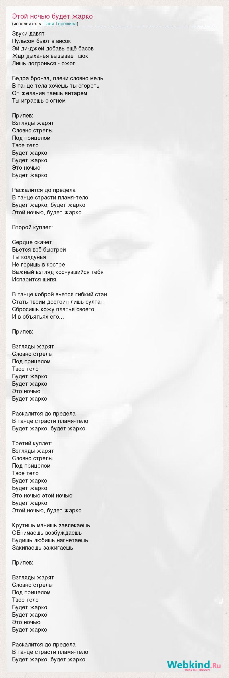 Звуки давят Пульсом бьют в висок Эй ди-джей добавь ещё басов Жар дыханья вызывает шок Лишь дотронься - ожог Бедра бронза, плечи словно медь В танце тела хочешь ты сгореть От желания таешь янтарем Ты играешь с огнем Припев: Взгляды жарят Словно стрелы Под прицелом Твое тело Будет жарко Будет жарко Это ночью Будет жарко Раскалится до предела В танце страсти пламя-тело Будет жарко, будет жарко Этой ночью, будет жарко Второй куплет: Сердце скачет Бьется всё быстрей Ты колдунья Не горишь в костре Важный взгляд коснувшийся тебя Испарится шипя. В танце коброй вьется гибкий стан Стать твоим достоин лишь султан Сбросишь кожу платья своего И в объятьях его... Припев: Взгляды жарят Словно стрелы Под прицелом Твое тело Будет жарко Будет жарко Это ночью Будет жарко Раскалится до предела В танце страсти пламя-тело Будет жарко, будет жарко Третий куплет: Взгляды жарят Словно стрелы Под прицелом Твое тело Будет жарко Будет жарко Это ночью этой ночью Будет жарко Этой ночью, будет жарко Крутишь манишь завлекаешь ОБнимаешь возбуждаешь Будишь любишь нагнетаешь Закипаешь зажигаешь Припев: Взгляды жарят Словно стрелы Под прицелом Твое тело Будет жарко Будет жарко Это ночью Будет жарко Раскалится до предела В танце страсти пламя-тело Будет жарко, будет жарко
