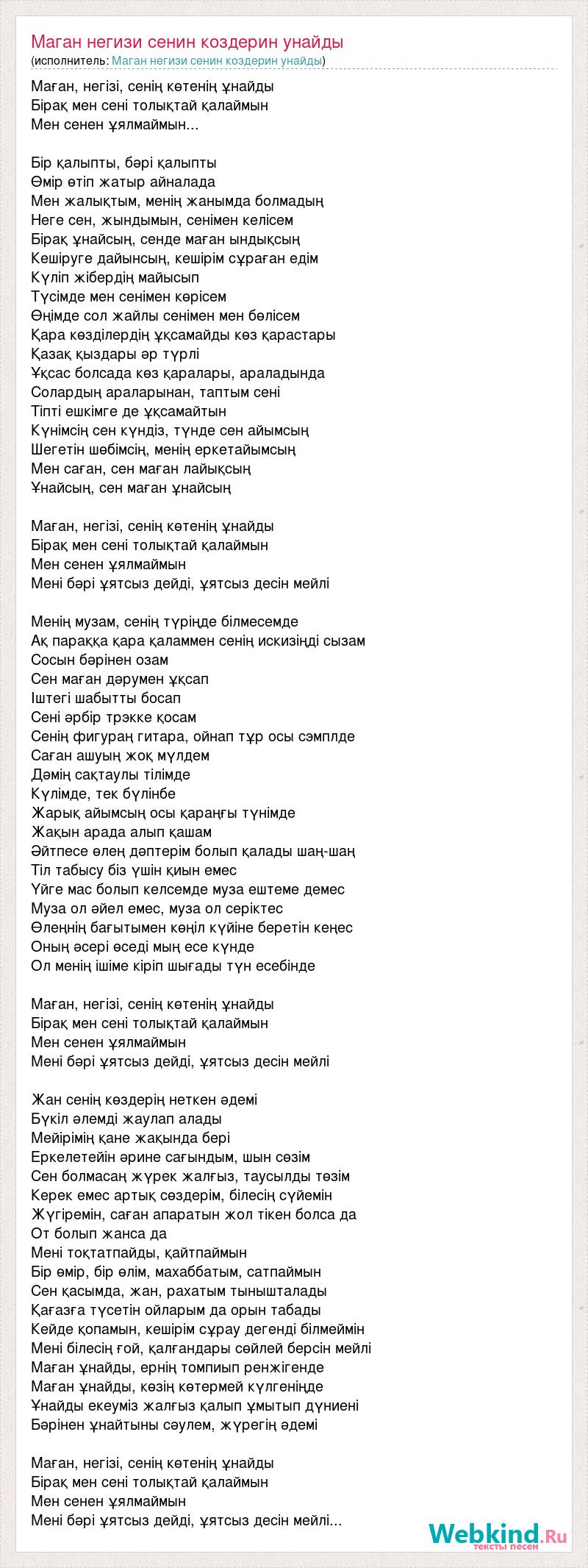 Маған, негізі, сенің көтенің ұнайды Бірақ мен сені толықтай қалаймын Мен сенен ұялмаймын... Бір қалыпты, бәрі қалыпты Өмір өтіп жатыр айналада Мен жалықтым, менің жанымда болмадың Неге сен, жындымын, сенімен келісем Бірақ ұнайсың, сенде маған ындықсың Кешіруге дайынсың, кешірім сұраған едім Күліп жібердің майысып Түсімде мен сенімен көрісем Өңімде сол жайлы сенімен мен бөлісем Қара көзділердің ұқсамайды көз қарастары Қазақ қыздары әр түрлі Ұқсас болсада көз қаралары, араладында Солардың араларынан, таптым сені Тіпті ешкімге де ұқсамайтын Күнімсің сен күндіз, түнде сен айымсың Шегетін шөбімсің, менің еркетайымсың Мен саған, сен маған лайықсың Ұнайсың, сен маған ұнайсың Маған, негізі, сенің көтенің ұнайды Бірақ мен сені толықтай қалаймын Мен сенен ұялмаймын Мені бәрі ұятсыз дейді, ұятсыз десін мейлі Менің музам, сенің түріңде білмесемде Ақ параққа қара қаламмен сенің искизіңді сызам Сосын бәрінен озам Сен маған дәрумен ұқсап Іштегі шабытты босап Сені әрбір трэкке қосам Сенің фигураң гитара, ойнап тұр осы сэмплде Саған ашуың жоқ мүлдем Дәмің сақтаулы тілімде Күлімде, тек бүлінбе Жарық айымсың осы қараңғы түнімде Жақын арада алып қашам Әйтпесе өлең дәптерім болып қалады шаң-шаң Тіл табысу біз үшін қиын емес Үйге мас болып келсемде муза ештеме демес Муза ол әйел емес, муза ол серіктес Өлеңнің бағытымен көңіл күйіне беретін кеңес Оның әсері өседі мың есе күнде Ол менің ішіме кіріп шығады түн есебінде Маған, негізі, сенің көтенің ұнайды Бірақ мен сені толықтай қалаймын Мен сенен ұялмаймын Мені бәрі ұятсыз дейді, ұятсыз десін мейлі Жан сенің көздерің неткен әдемі Бүкіл әлемді жаулап алады Мейірімің қане жақында бері Еркелетейін әрине сағындым, шын сөзім Сен болмасаң жүрек жалғыз, таусылды төзім Керек емес артық сөздерім, білесің сүйемін Жүгіремін, саған апаратын жол тікен болса да От болып жанса да Мені тоқтатпайды, қайтпаймын Бір өмір, бір өлім, махаббатым, сатпаймын Сен қасымда, жан, рахатым тынышталады Қағазға түсетін ойларым да орын табады Кейде қопамын, кешірім сұрау дегенді білмеймін Мені білесің ғой, қалғандары сөйлей берсін мейлі Маған ұнайды, ернің томпиып ренжігенде Маған ұнайды, көзің көтермей күлгеніңде Ұнайды екеуміз жалғыз қалып ұмытып дүниені Бәрінен ұнайтыны сәулем, жүрегің әдемі Маған, негізі, сенің көтенің ұнайды Бірақ мен сені толықтай қалаймын Мен сенен ұялмаймын Мені бәрі ұятсыз дейді, ұятсыз десін мейлі...