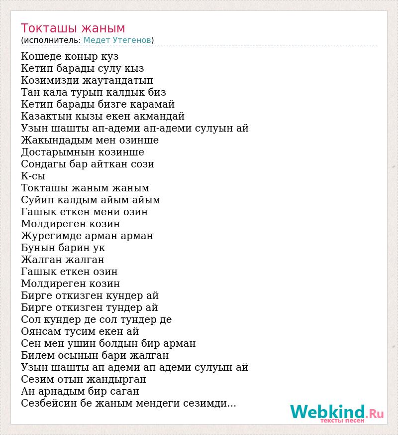 Кошеде коныр куз Кетип барады сулу кыз Козимизди жаутандатып Тан кала турып калдык биз Кетип барады бизге карамай Казактын кызы екен акмандай Узын шашты ап-адеми ап-адеми сулуын ай Жакындадым мен озинше Достарымнын козинше Сондагы бар айткан сози К-сы Токташы жаным жаным Суйип калдым айым айым Гашык еткен мени озин Молдиреген козин Журегимде арман арман Бунын барин ук Жалган жалган Гашык еткен озин Молдиреген козин Бирге откизген кундер ай Бирге откизген тундер ай Сол кундер де сол тундер де Оянсам тусим екен ай Сен мен ушин болдын бир арман Билем осынын бари жалган Узын шашты ап адеми ап адеми сулуын ай Сезим отын жандырган Ан арнадым бир саган Сезбейсин бе жаным мендеги сезимди...