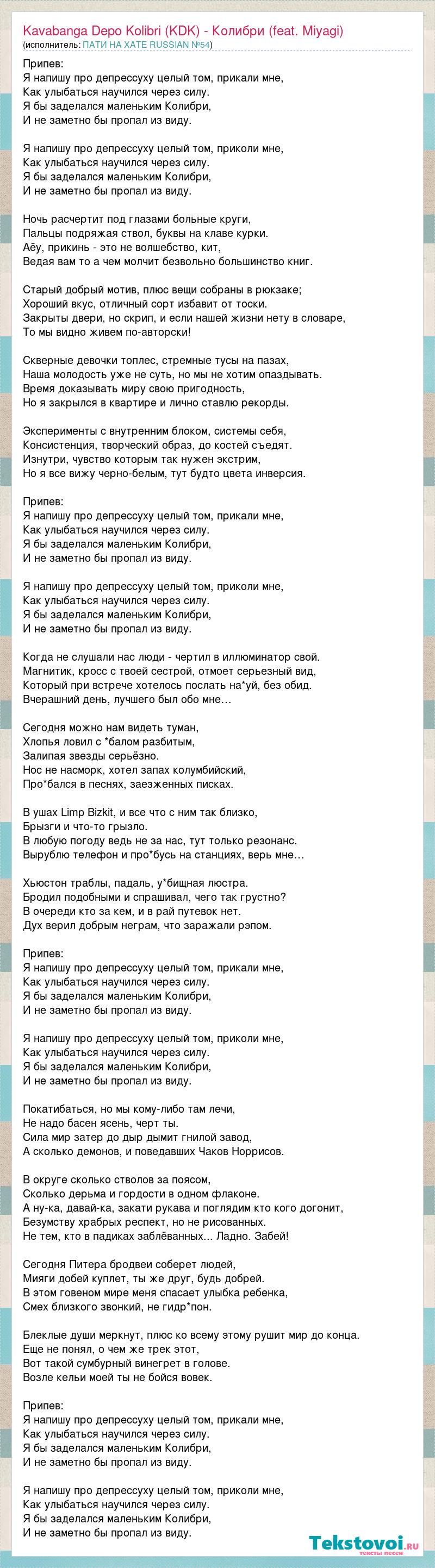 Припев: Я напишу про депрессуху целый том, прикали мне, Как улыбаться научился через силу. Я бы заделался маленьким Колибри, И не заметно бы пропал из виду. Я напишу про депрессуху целый том, приколи мне, Как улыбаться научился через силу. Я бы заделался маленьким Колибри, И не заметно бы пропал из виду. Ночь расчертит под глазами больные круги, Пальцы подряжая ствол, буквы на клаве курки. Аёу, прикинь - это не волшебство, кит, Ведая вам то а чем молчит безвольно большинство книг. Старый добрый мотив, плюс вещи собраны в рюкзаке; Хороший вкус, отличный сорт избавит от тоски. Закрыты двери, но скрип, и если нашей жизни нету в словаре, То мы видно живем по-авторски! Скверные девочки топлес, стремные тусы на пазах, Наша молодость уже не суть, но мы не хотим опаздывать. Время доказывать миру свою пригодность, Но я закрылся в квартире и лично ставлю рекорды. Эксперименты с внутренним блоком, системы себя, Консистенция, творческий образ, до костей съедят. Изнутри, чувство которым так нужен экстрим, Но я все вижу черно-белым, тут будто цвета инверсия. Припев: Я напишу про депрессуху целый том, прикали мне, Как улыбаться научился через силу. Я бы заделался маленьким Колибри, И не заметно бы пропал из виду. Я напишу про депрессуху целый том, приколи мне, Как улыбаться научился через силу. Я бы заделался маленьким Колибри, И не заметно бы пропал из виду. Когда не слушали нас люди - чертил в иллюминатор свой. Магнитик, кросс с твоей сестрой, отмоет серьезный вид, Который при встрече хотелось послать на*уй, без обид. Вчерашний день, лучшего был обо мне… Сегодня можно нам видеть туман, Хлопья ловил с *балом разбитым, Залипая звезды серьёзно. Нос не насморк, хотел запах колумбийский, Про*бался в песнях, заезженных писках. В ушах Limp Bizkit, и все что с ним так близко, Брызги и что-то грызло. В любую погоду ведь не за нас, тут только резонанс. Вырублю телефон и про*бусь на станциях, верь мне… Хьюстон траблы, падаль, у*бищная люстра. Бродил подобными и спрашивал, чего так грустно? В очереди кто за кем, и в рай путевок нет. Дух верил добрым неграм, что заражали рэпом. Припев: Я напишу про депрессуху целый том, прикали мне, Как улыбаться научился через силу. Я бы заделался маленьким Колибри, И не заметно бы пропал из виду. Я напишу про депрессуху целый том, приколи мне, Как улыбаться научился через силу. Я бы заделался маленьким Колибри, И не заметно бы пропал из виду. Покатибаться, но мы кому-либо там лечи, Не надо басен ясень, черт ты. Сила мир затер до дыр дымит гнилой завод, А сколько демонов, и поведавших Чаков Норрисов. В округе сколько стволов за поясом, Сколько дерьма и гордости в одном флаконе. А ну-ка, давай-ка, закати рукава и поглядим кто кого догонит, Безумству храбрых респект, но не рисованных. Не тем, кто в падиках заблёванных... Ладно. Забей! Сегодня Питера бродвеи соберет людей, Мияги добей куплет, ты же друг, будь добрей. В этом говеном мире меня спасает улыбка ребенка, Смех близкого звонкий, не гидр*пон. Блеклые души меркнут, плюс ко всему этому рушит мир до конца. Еще не понял, о чем же трек этот, Вот такой сумбурный винегрет в голове. Возле кельи моей ты не бойся вовек. Припев: Я напишу про депрессуху целый том, прикали мне, Как улыбаться научился через силу. Я бы заделался маленьким Колибри, И не заметно бы пропал из виду. Я напишу про депрессуху целый том, приколи мне, Как улыбаться н