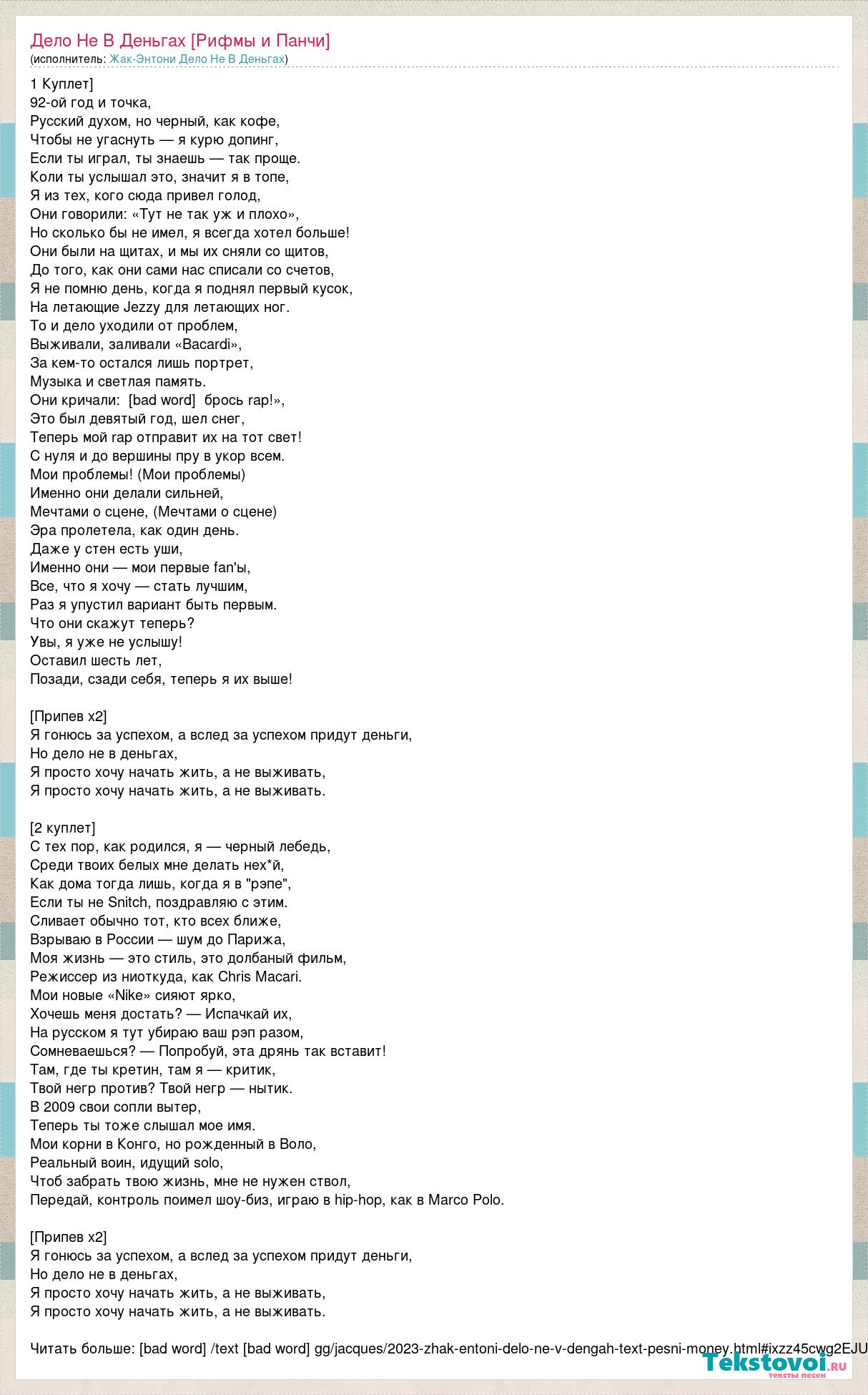 1 Куплет] 92-ой год и точка, Русский духом, но черный, как кофе, Чтобы не угаснуть — я курю допинг, Если ты играл, ты знаешь — так проще. Коли ты услышал это, значит я в топе, Я из тех, кого сюда привел голод, Они говорили: «Тут не так уж и плохо», Но сколько бы не имел, я всегда хотел больше! Они были на щитах, и мы их сняли со щитов, До того, как они сами нас списали со счетов, Я не помню день, когда я поднял первый кусок, На летающие Jezzy для летающих ног. То и дело уходили от проблем, Выживали, заливали «Bacardi», За кем-то остался лишь портрет, Музыка и светлая память. Они кричали: [bad word] брось rap!», Это был девятый год, шел снег, Теперь мой rap отправит их на тот свет! С нуля и до вершины пру в укор всем. Мои проблемы! (Мои проблемы) Именно они делали сильней, Мечтами о сцене, (Мечтами о сцене) Эра пролетела, как один день. Даже у стен есть уши, Именно они — мои первые fan'ы, Все, что я хочу — стать лучшим, Раз я упустил вариант быть первым. Что они скажут теперь? Увы, я уже не услышу! Оставил шесть лет, Позади, сзади себя, теперь я их выше! [Припев x2] Я гонюсь за успехом, а вслед за успехом придут деньги, Но дело не в деньгах, Я просто хочу начать жить, а не выживать, Я просто хочу начать жить, а не выживать. [2 куплет] С тех пор, как родился, я — черный лебедь, Среди твоих белых мне делать нех*й, Как дома тогда лишь, когда я в "рэпе", Если ты не Snitch, поздравляю с этим. Сливает обычно тот, кто всех ближе, Взрываю в России — шум до Парижа, Моя жизнь — это стиль, это долбаный фильм, Режиссер из ниоткуда, как Chris Macari. Мои новые «Nike» сияют ярко, Хочешь меня достать? — Испачкай их, На русском я тут убираю ваш рэп разом, Сомневаешься? — Попробуй, эта дрянь так вставит! Там, где ты кретин, там я — критик, Твой негр против? Твой негр — нытик. В 2009 свои сопли вытер, Теперь ты тоже слышал мое имя. Мои корни в Конго, но рожденный в Воло, Реальный воин, идущий solo, Чтоб забрать твою жизнь, мне не нужен ствол, Передай, контроль поимел шоу-биз, играю в hip-hop, как в Marco Polo. [Припев x2] Я гонюсь за успехом, а вслед за успехом придут деньги, Но дело не в деньгах, Я просто хочу начать жить, а не выживать, Я просто хочу начать жить, а не выживать. Читать больше: [bad word] /text [bad word] gg/jacques/2023-zhak-entoni-delo-ne-v-dengah-text-pesni-money.html#ixzz45cwg2EJU